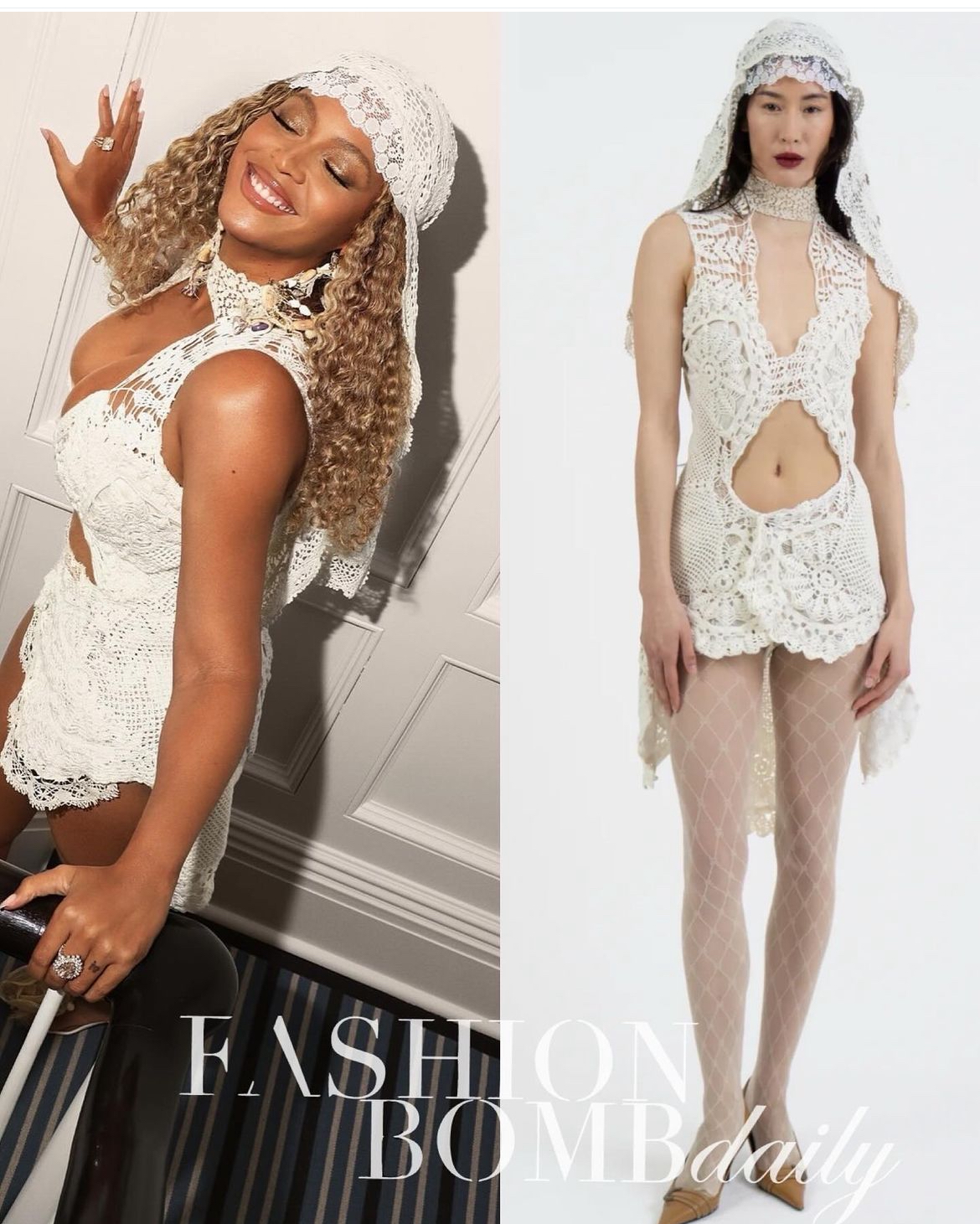 The original look, which retailed for $1,355 features cut out details and a virginal lace hair covering: