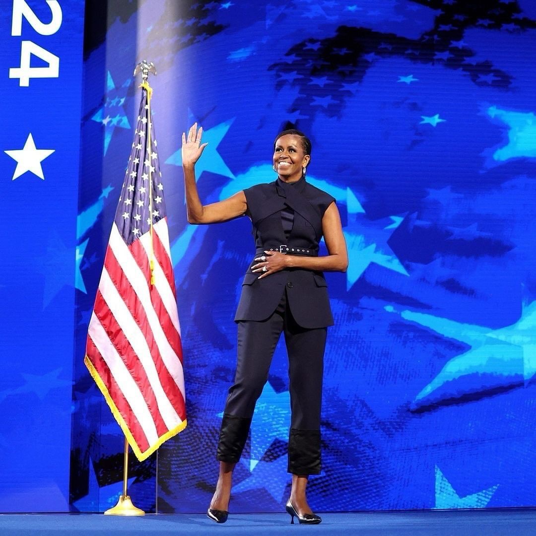 Michelle Obama delivered a rousing speech in support of Presidential Candidate Kamala Harris wearing a blue suit by Monse, styled by Meredith Koop.