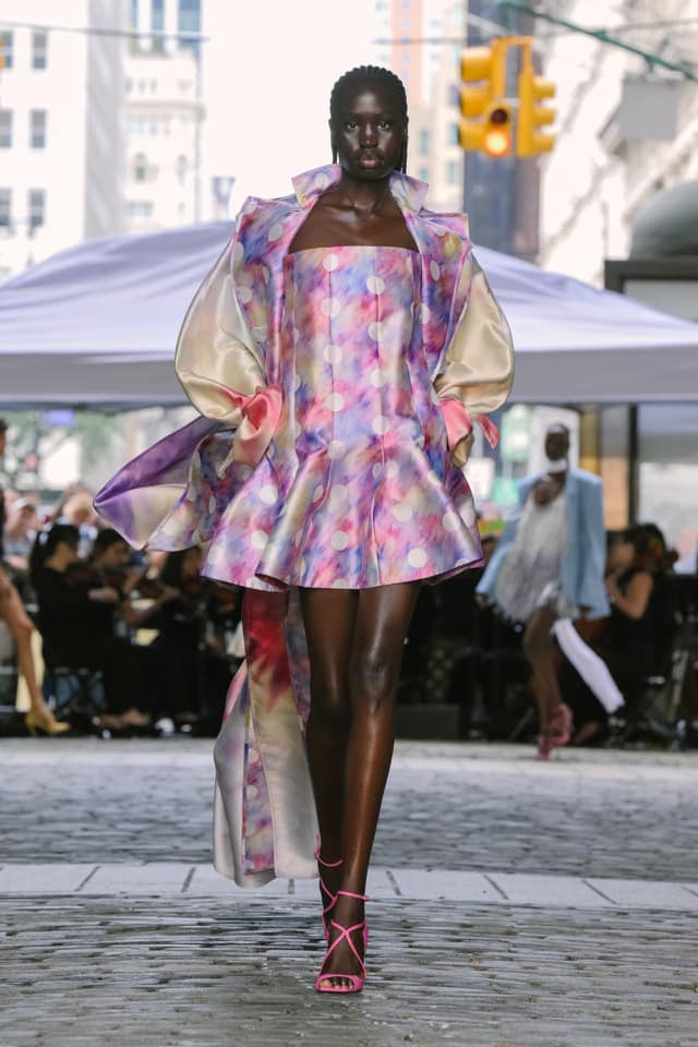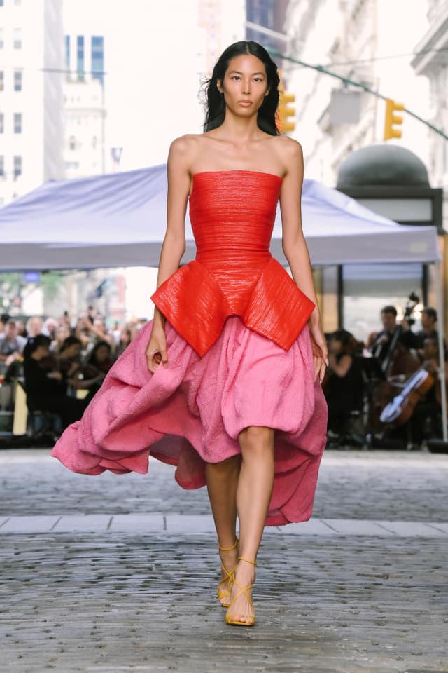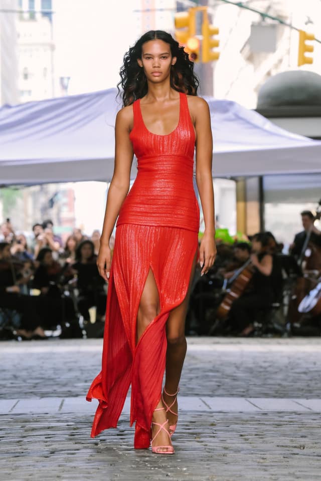 In addition to bold textures and head-turning prints, the New York based designer also showed his chops with evening wear. His red bandage halter top dress characterized with pink silk ruffles was unlike anything we’ve seen as of late.