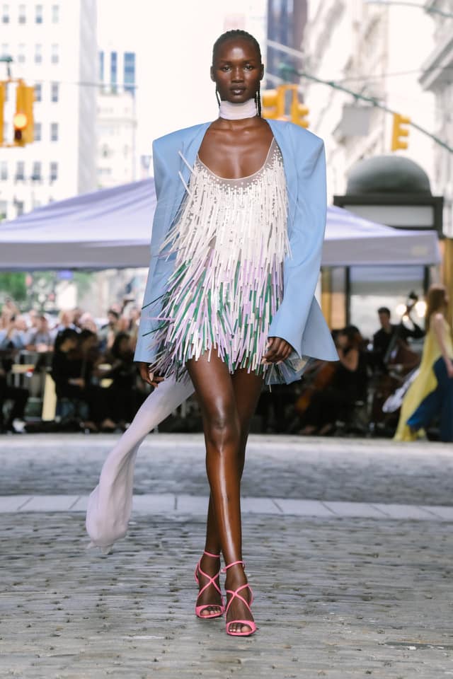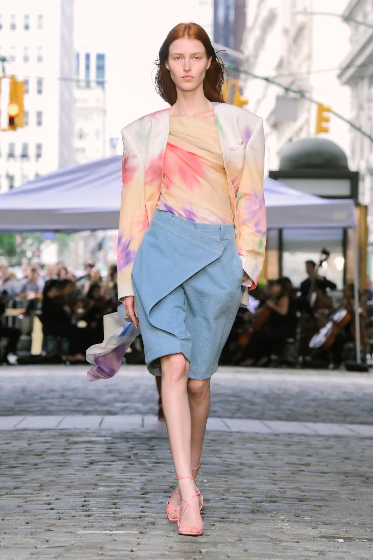 Refreshing and inviting, Gurung paired an ocean blue blazer with a multicolor embellished dress, and white silk scarf that effortlessly blew in the wind. In a similar shade of blue, we saw asymmetrical shorts paired back with a colorful pastel top and blazer set.