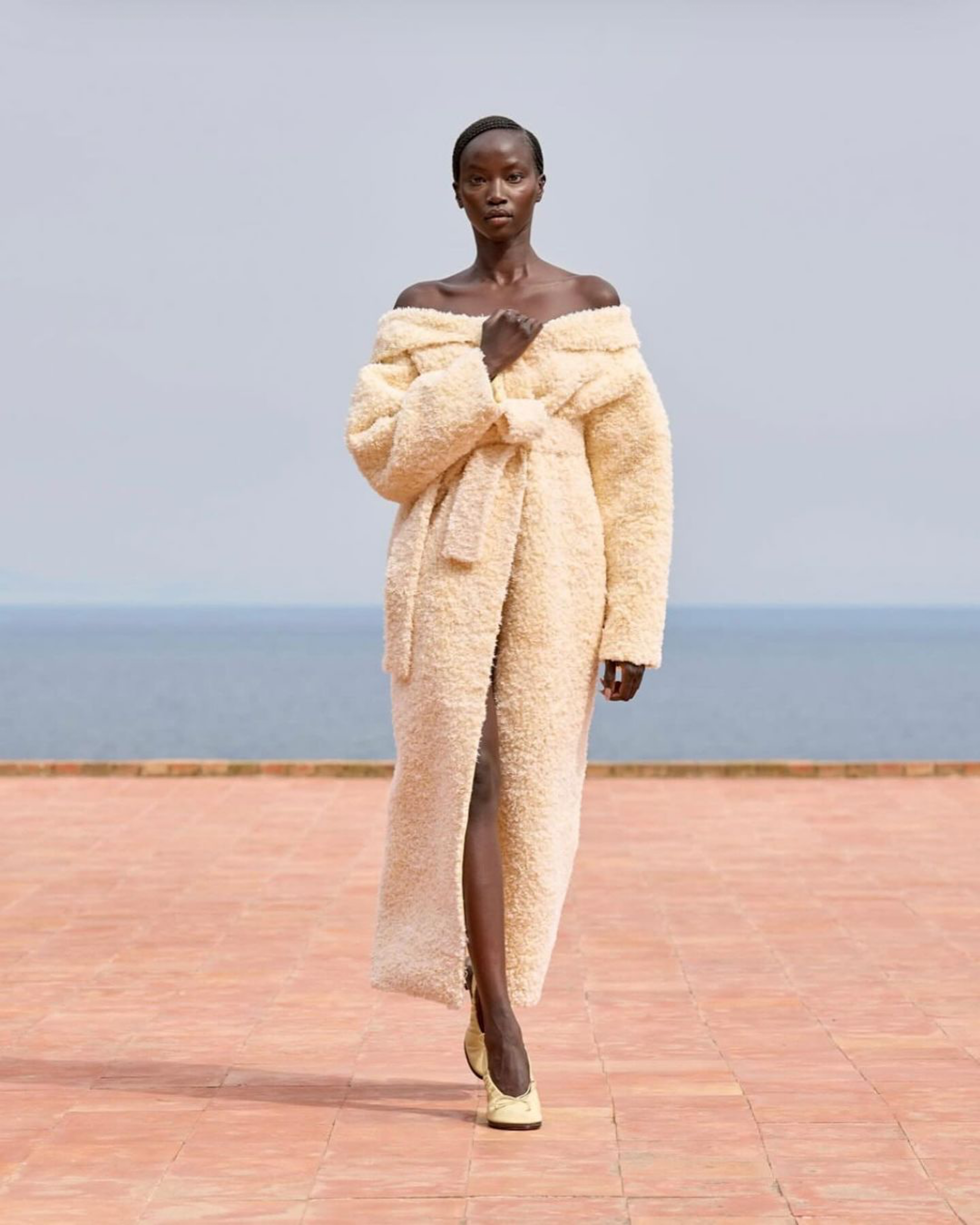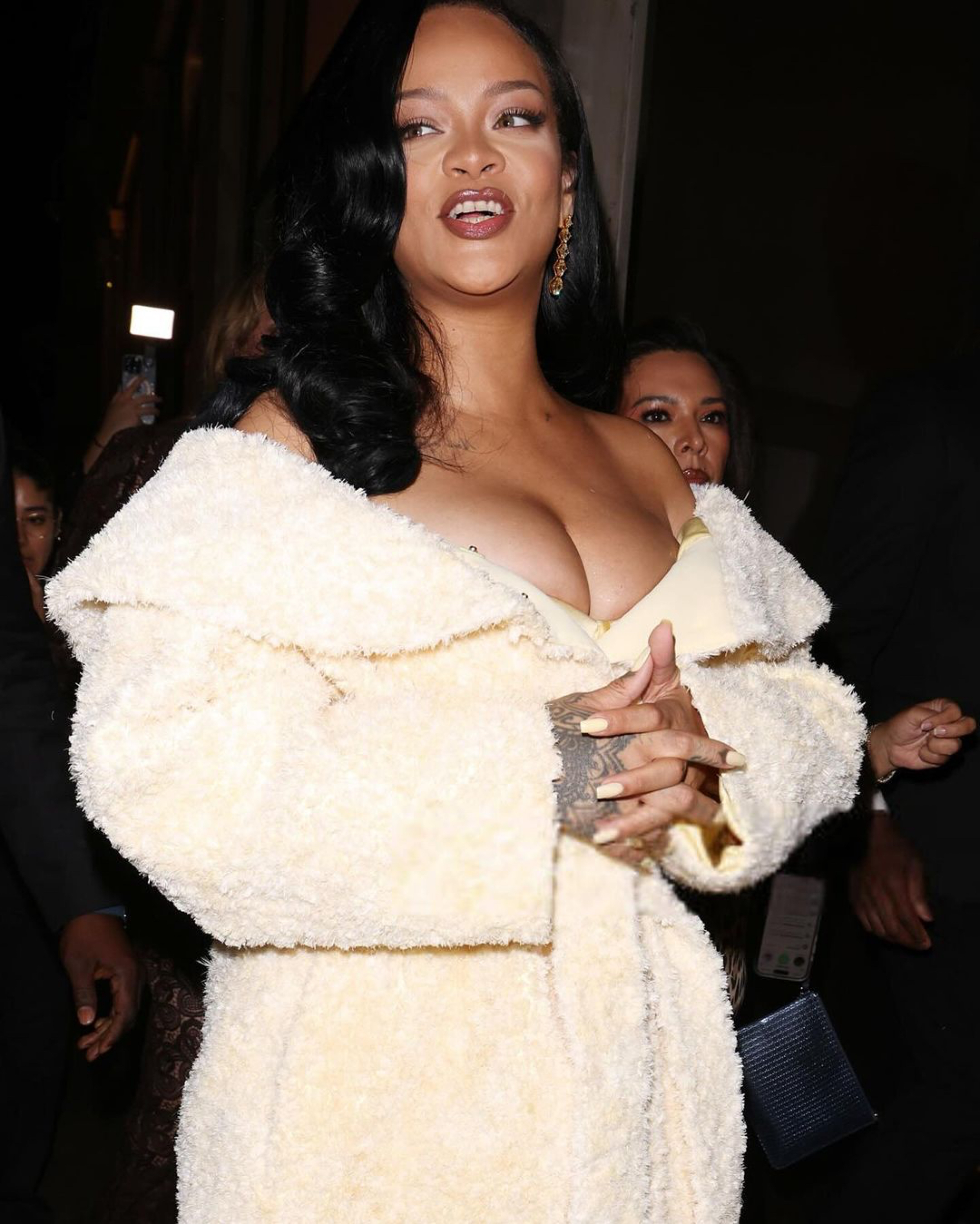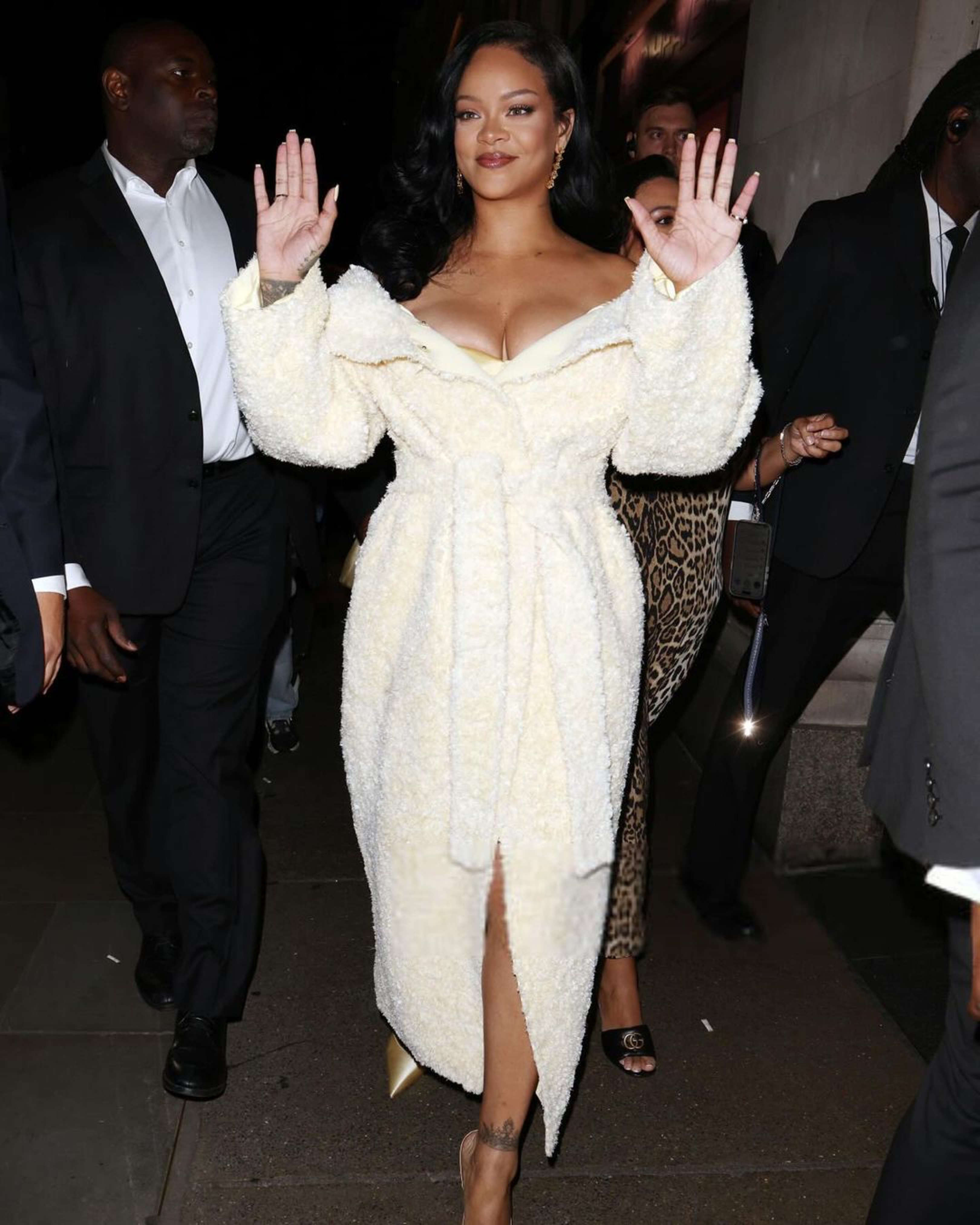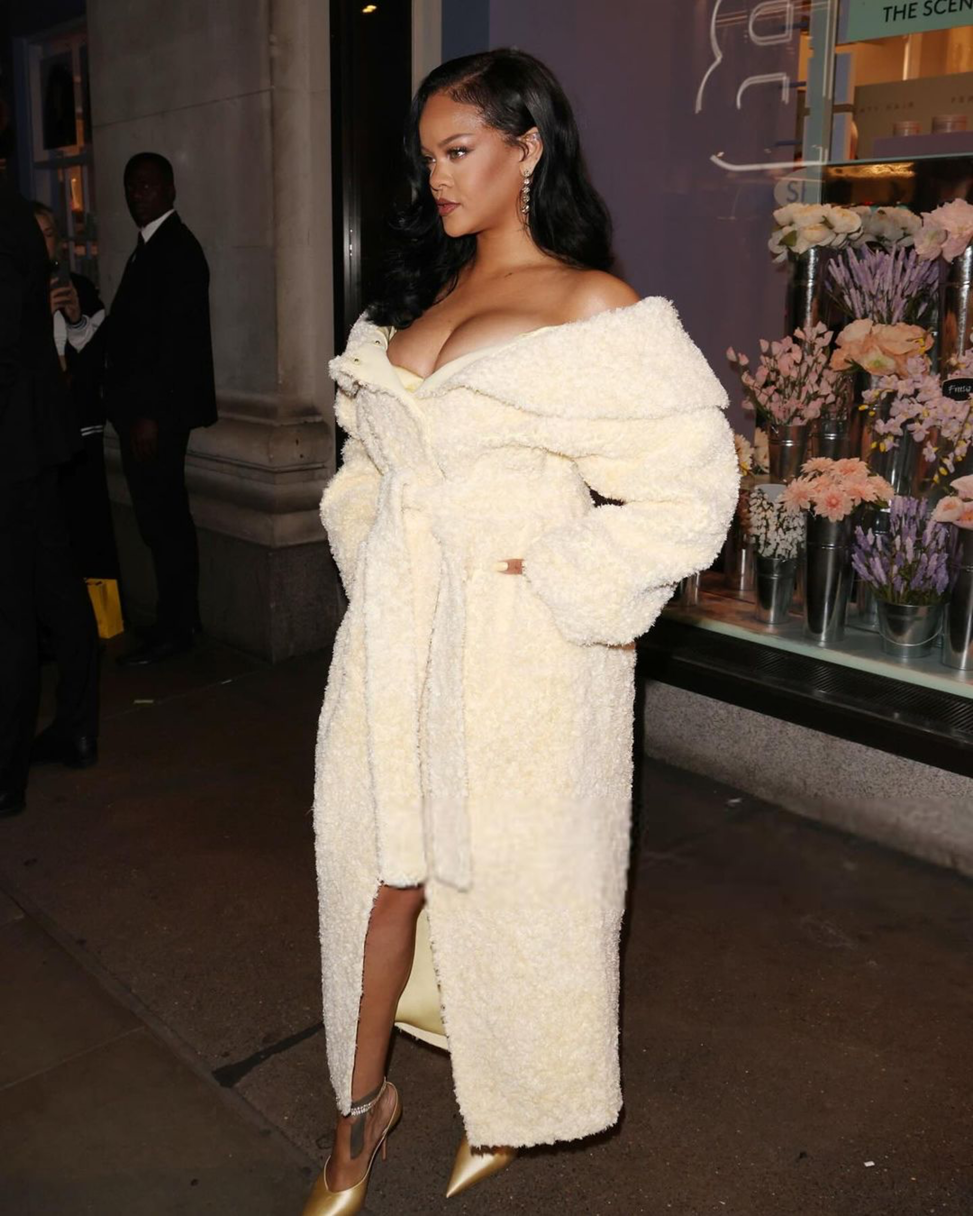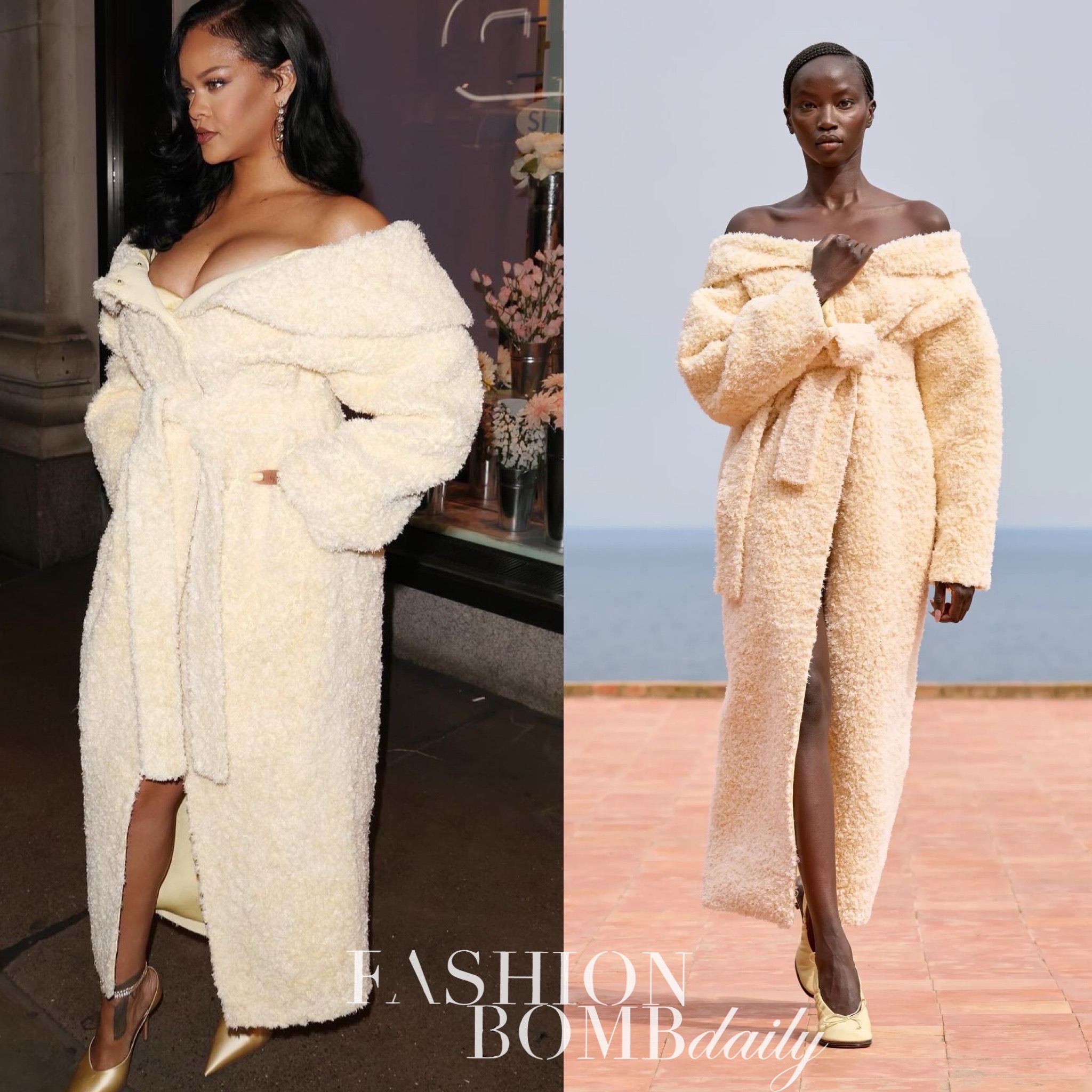 Fenty Hair just touched down in London town with an influencer filled event! Fenty Hair Founder, Rihanna, blessed the occasion in a creamy white off the shoulder Jacquemus coat: