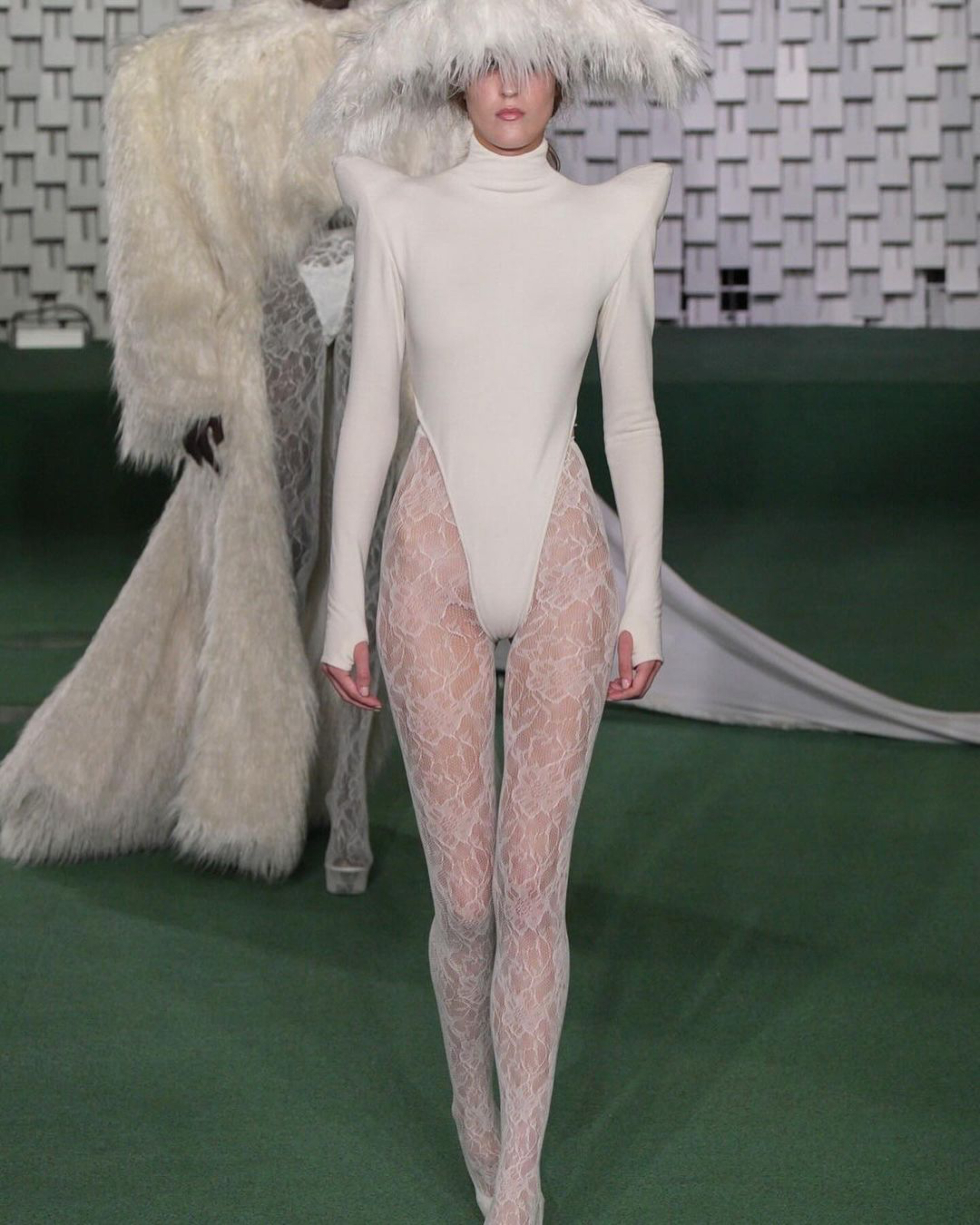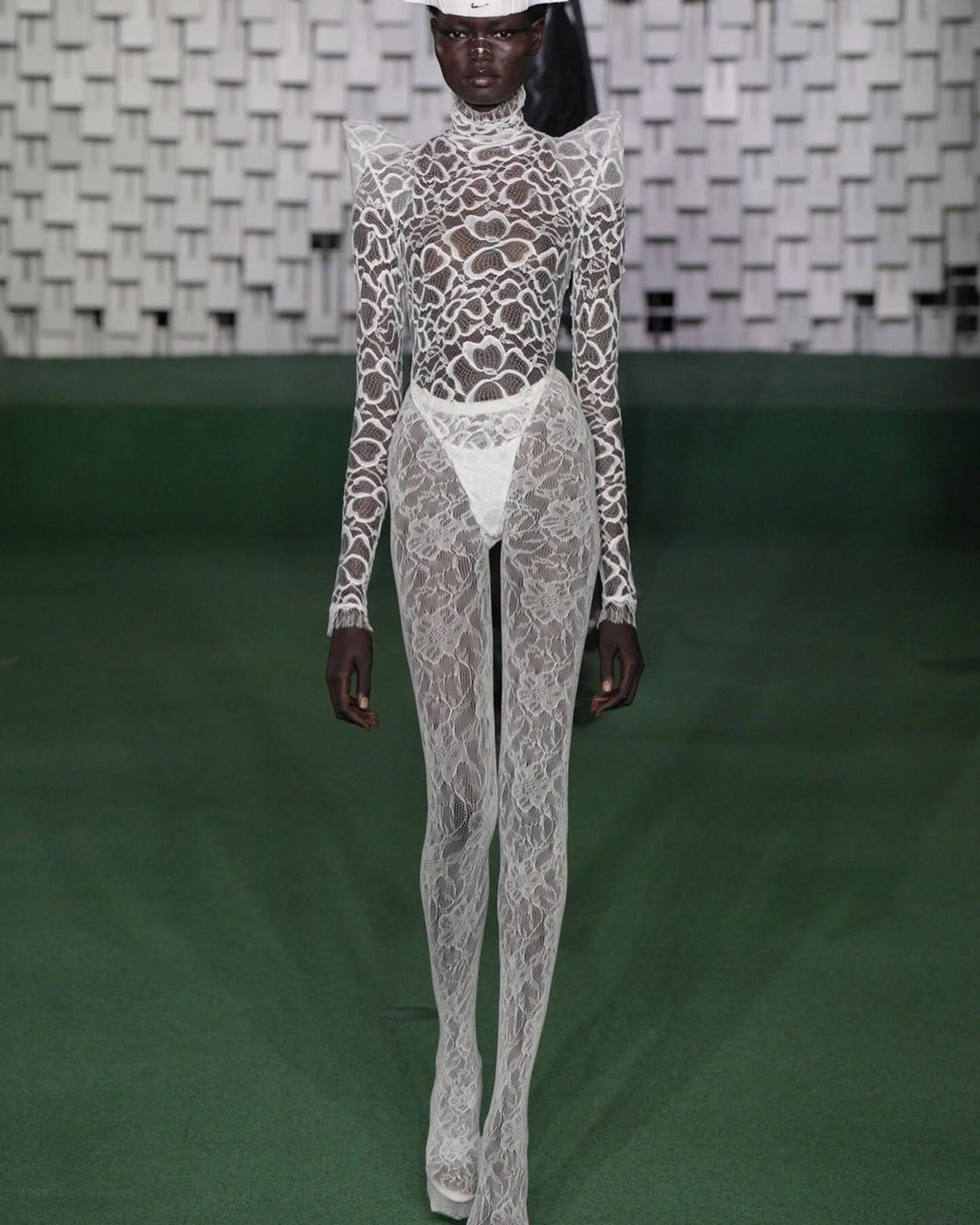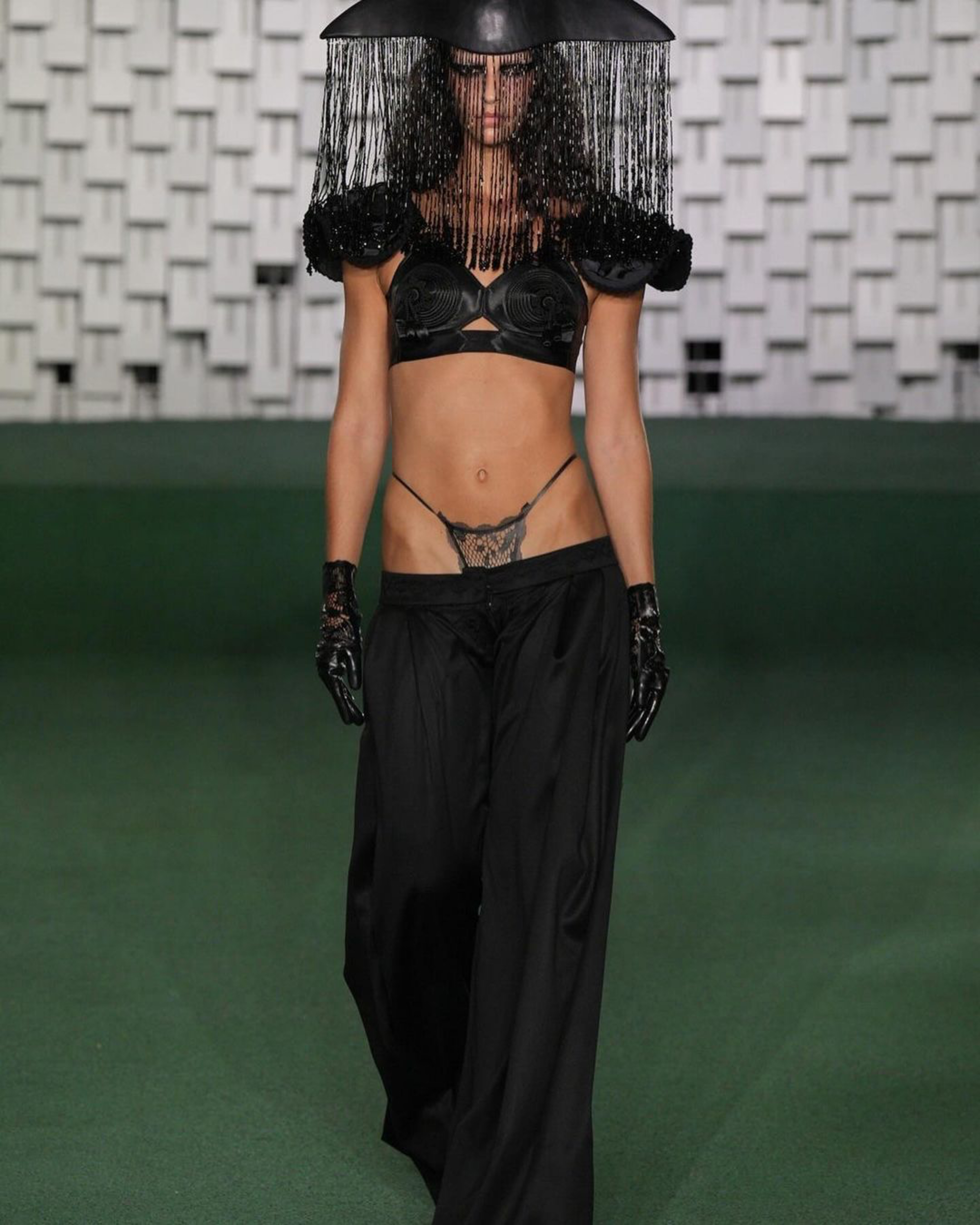 Cool kids snaked down the sidewalk outside of the Espace Niemeyer, a former Headquarters of the Communist Party which now moonlights as a futuristic venue with a stark geodesic sphere decorating the lawn. Guests, mostly clad in all black, sauntered into the spaceship-like space, ambling into an inner dome that beamed lights down on the collection amidst glittering chrome tiles. Lithe models sauntered slowly down the runway, most boasting barely there sheer lace bodysuits, dresses and pants that boldly exposed breasts and thongs.