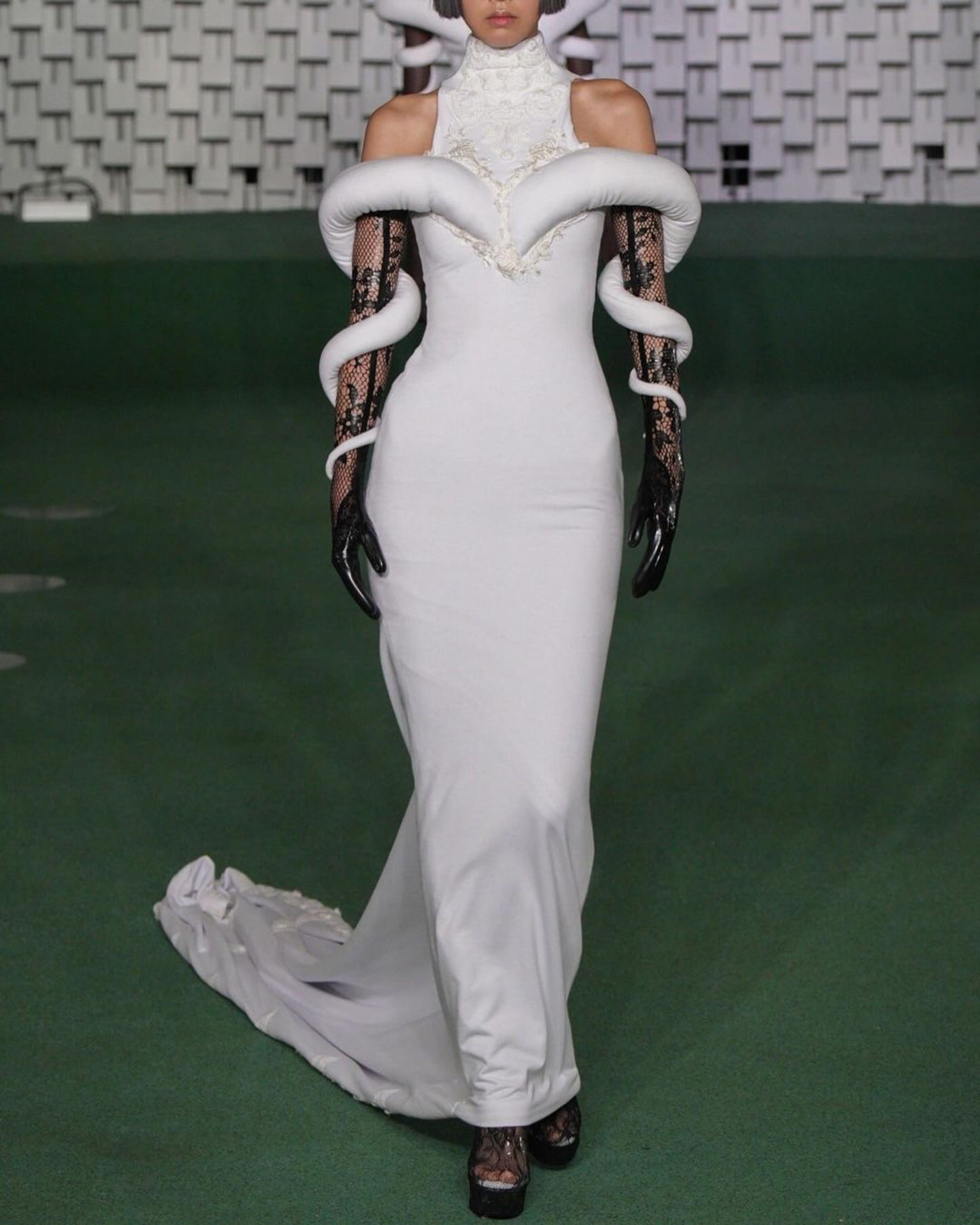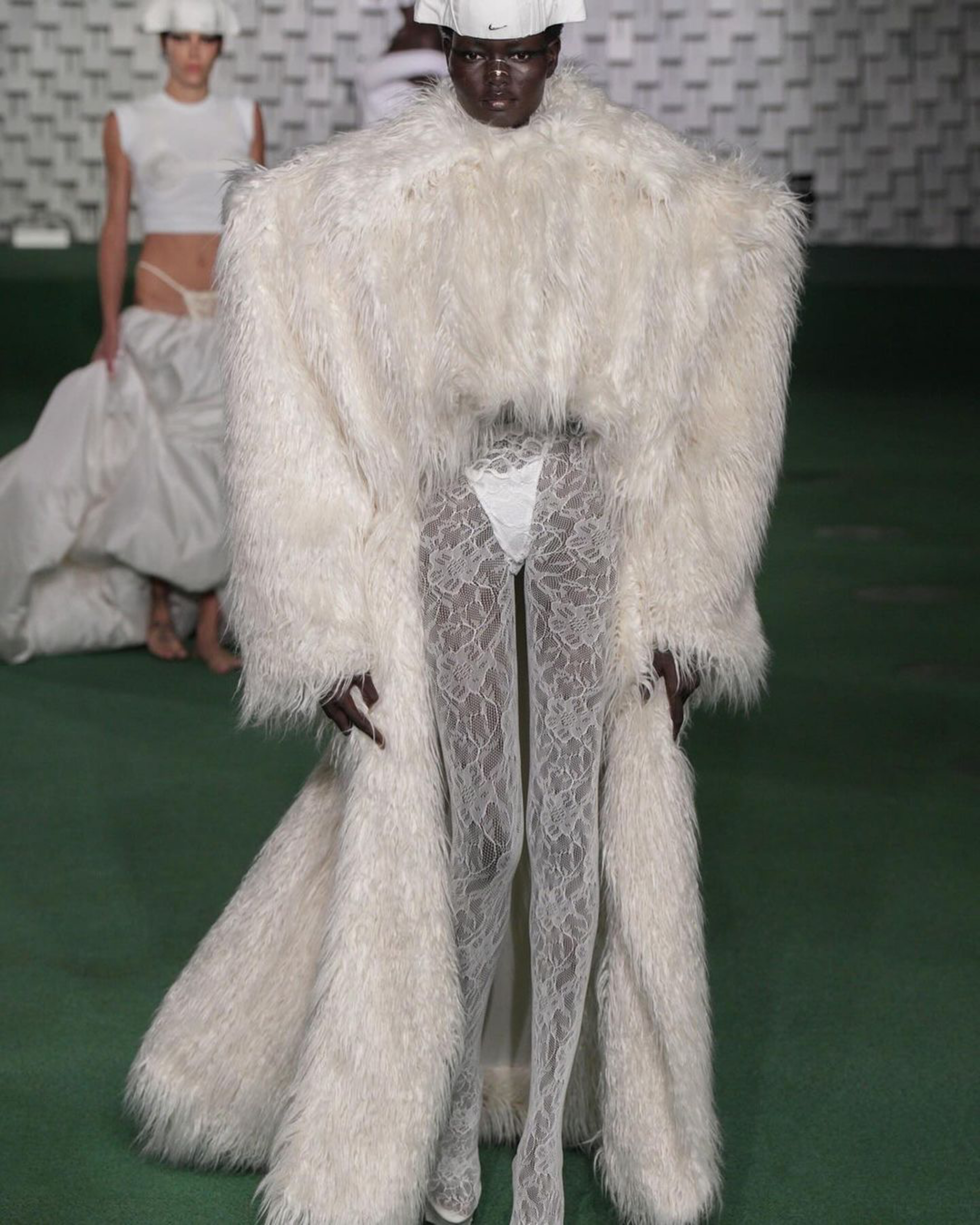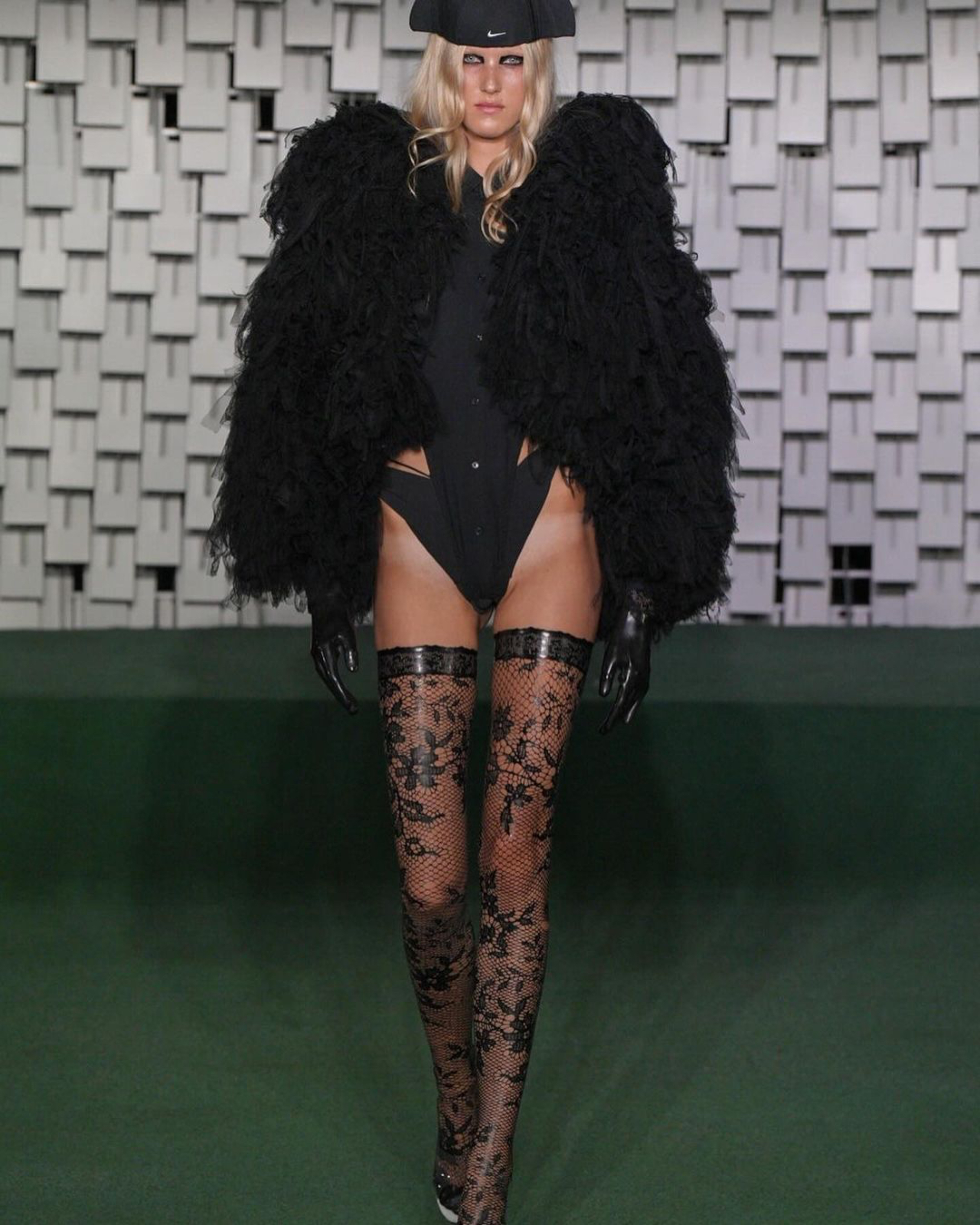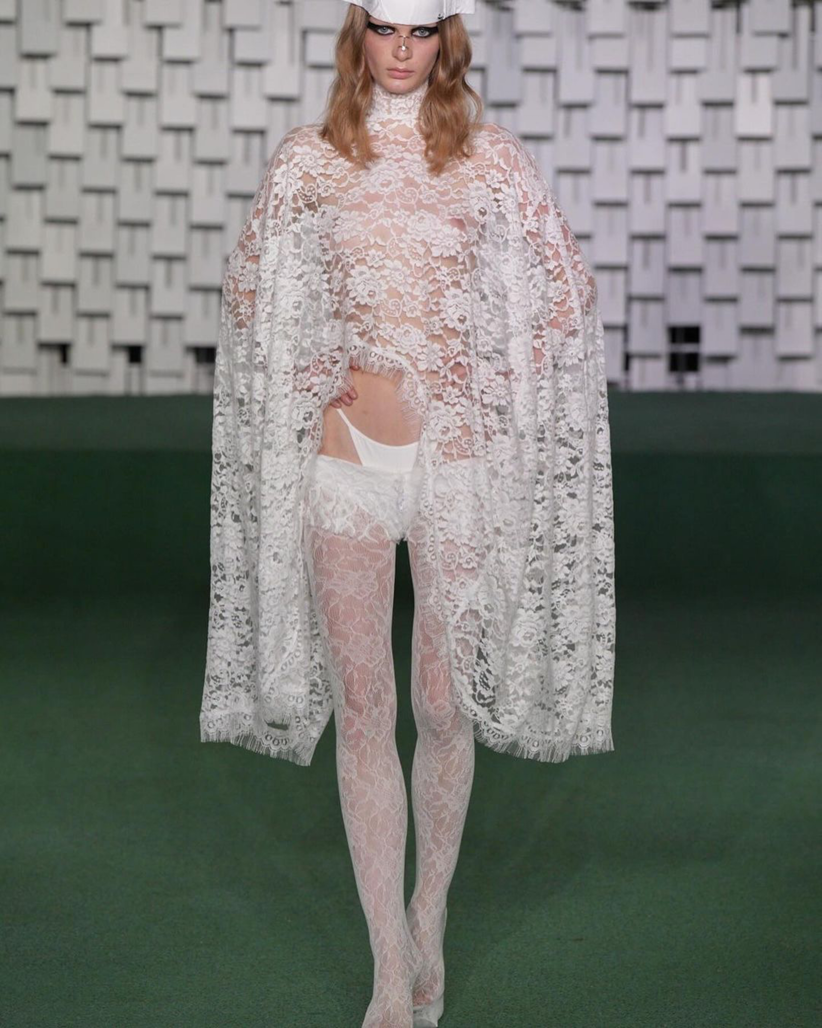 Cool kids snaked down the sidewalk outside of the Espace Niemeyer, a former Headquarters of the Communist Party which now moonlights as a futuristic venue with a stark geodesic sphere decorating the lawn. Guests, mostly clad in all black, sauntered into the spaceship-like space, ambling into an inner dome that beamed lights down on the collection amidst glittering chrome tiles. Lithe models sauntered slowly down the runway, most boasting barely there sheer lace bodysuits, dresses and pants that boldly exposed breasts and thongs.