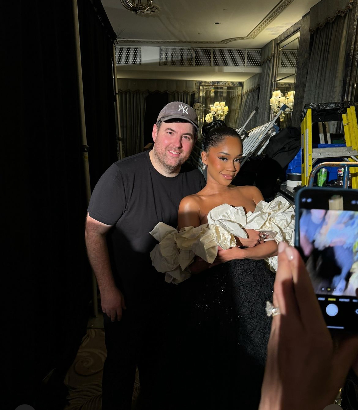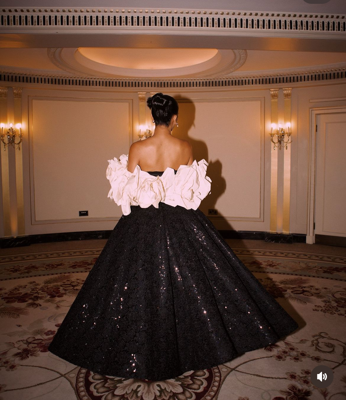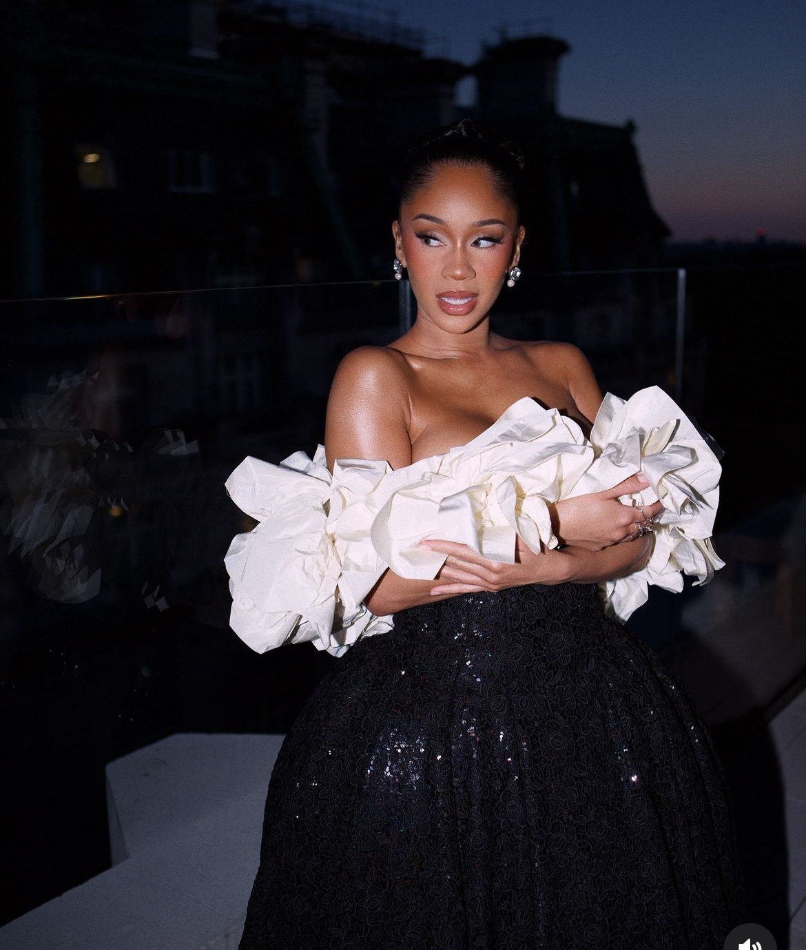 Saweetie stole the style spotlight at The Dorchester in London as she posed in an off-the-shoulder black sequin laced gown that had a cream 3-D floral bodice. With peach eyeshadow and a warm neutral tone lip that glistened in the midnight sky, she looked like a femme fatale.