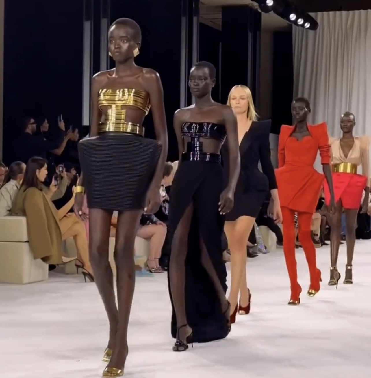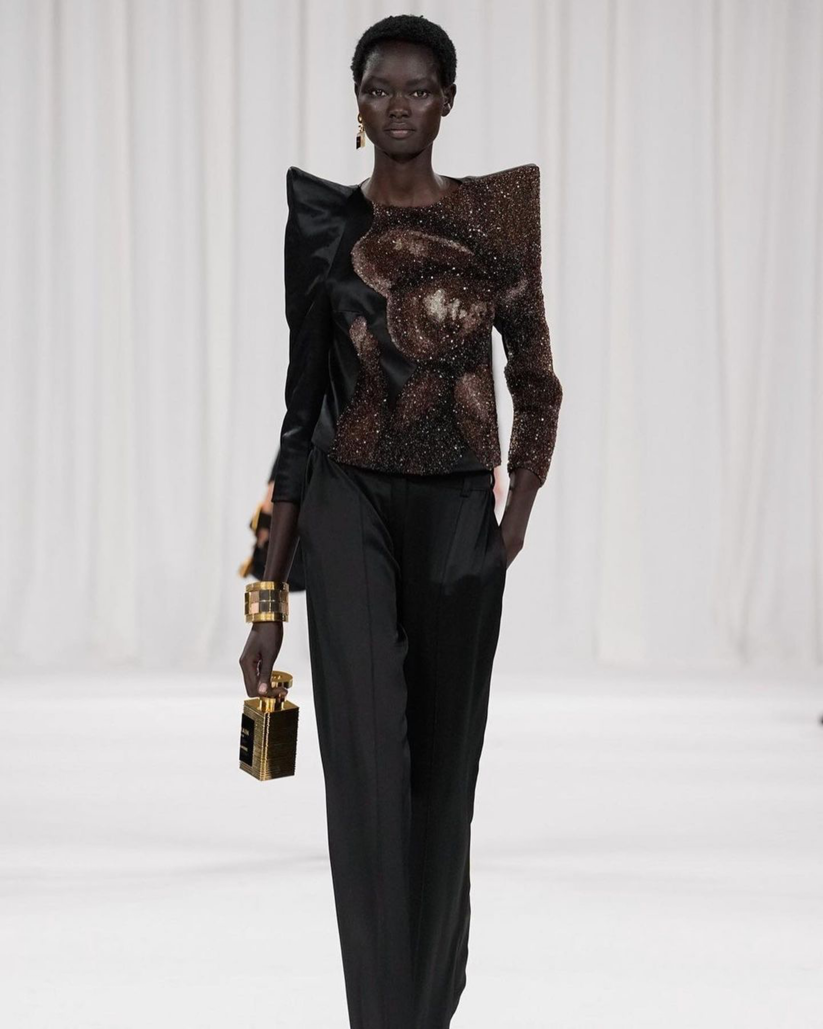 Gold belts, gold tipped heels, fold over boots, gold necklaces, “belt” tote bags. Accessories were inspired by tubes of Balmain lipstick, eyeshadow palettes, and fragrance bottles.