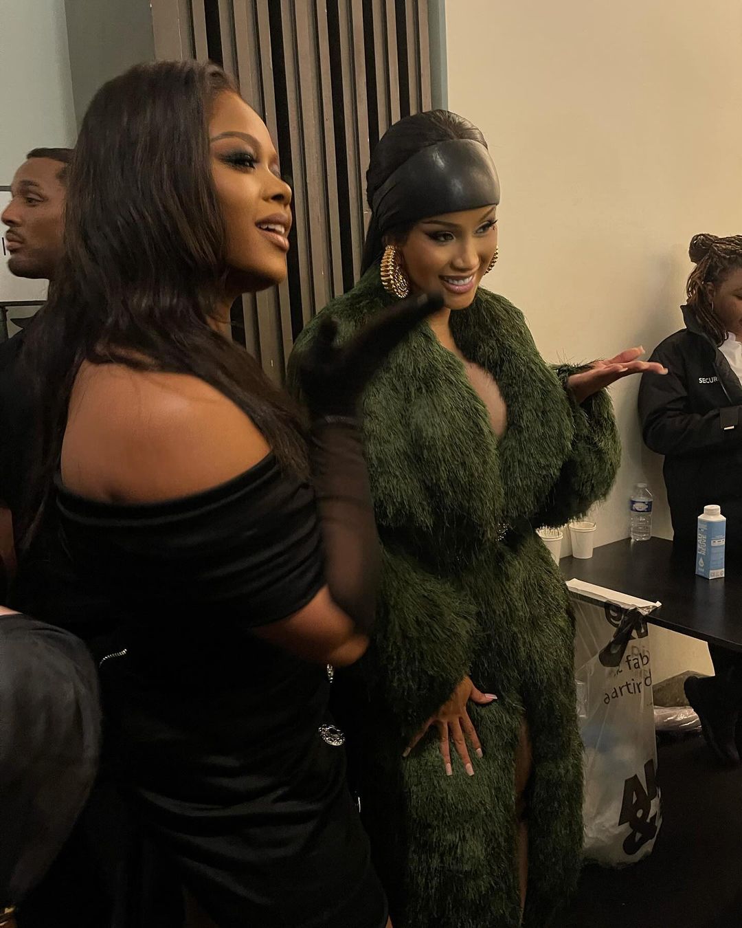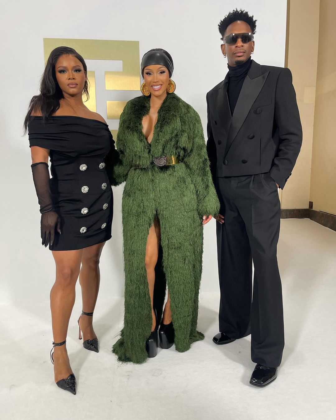 Cardi, who’s known for her lyrical flow and head-turning looks, arrived to see Olivier Rousteing designs in a long emerald green shaggy coat by the Parisian brand that was belted at the waist. Her leather headband and gold shell earrings were modern and beautiful.