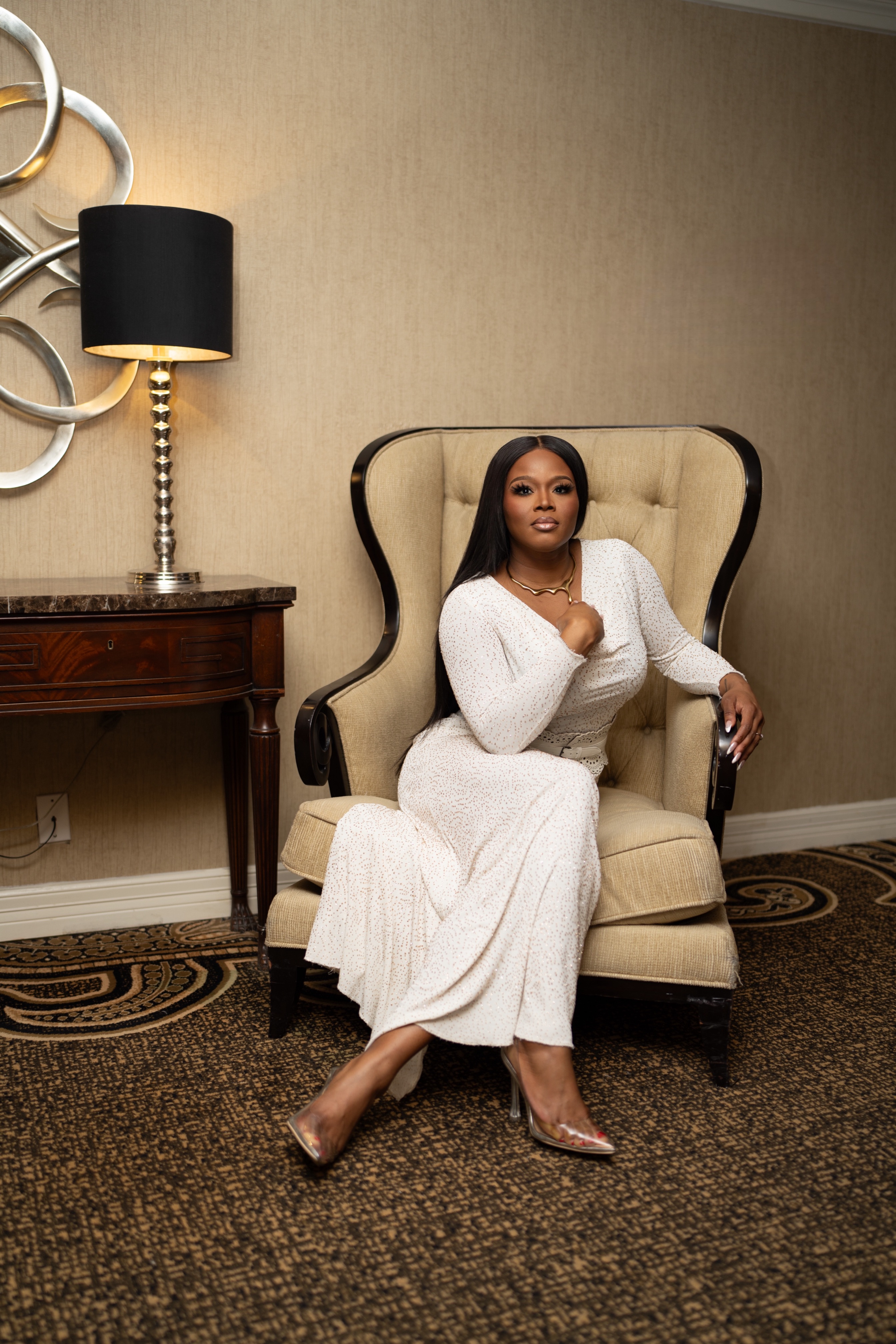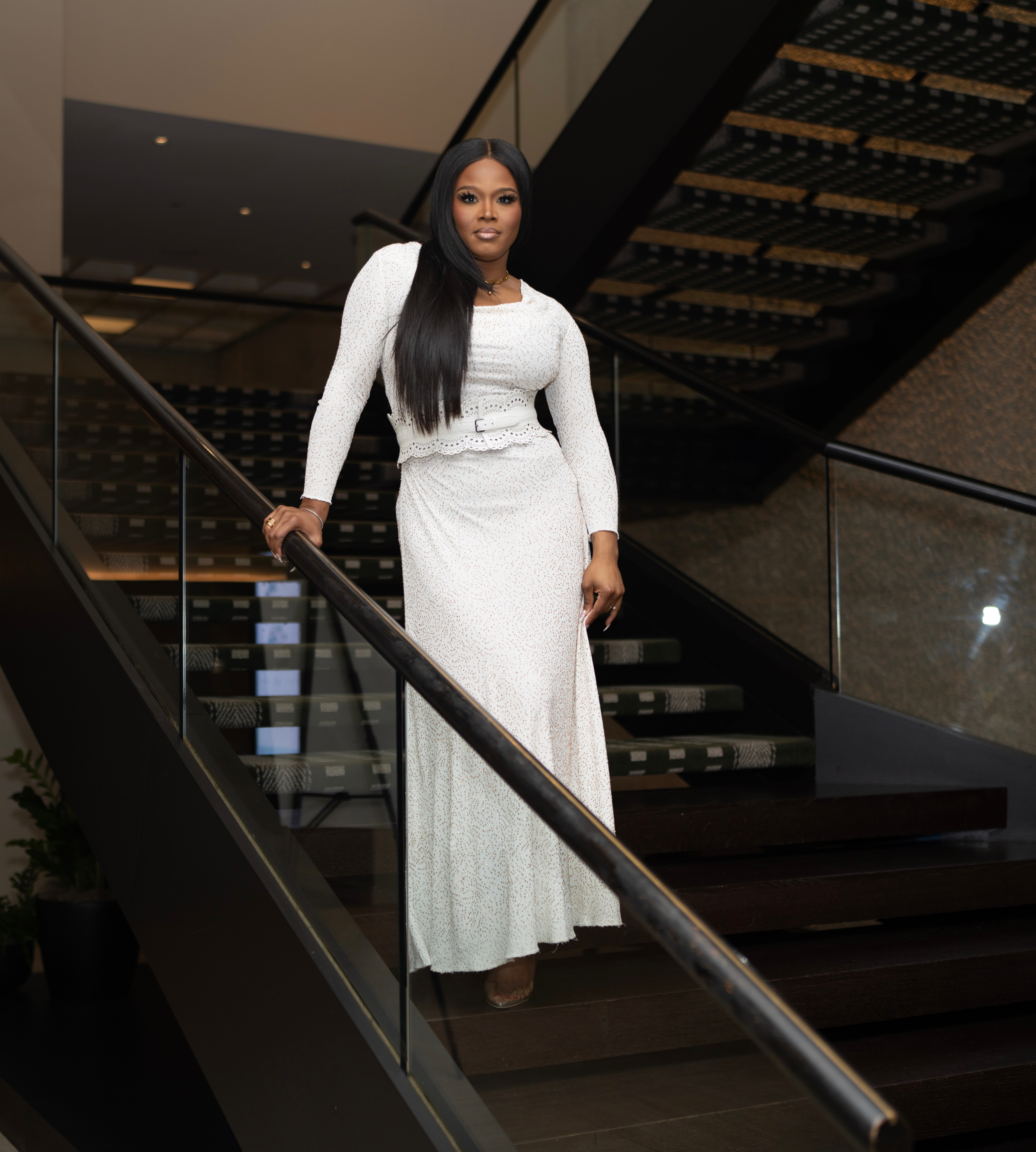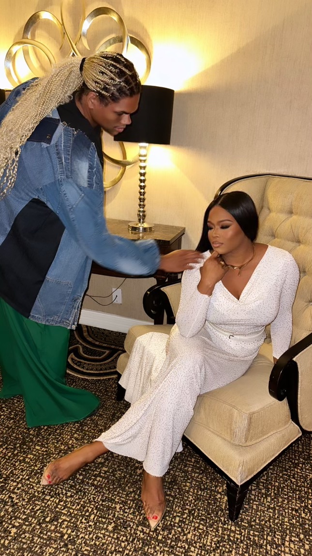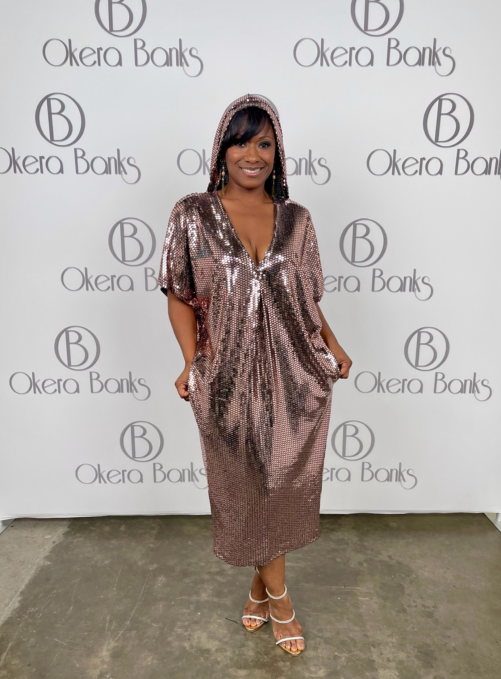 Okera was a vision in a sparkly gold dress with a matching hood.