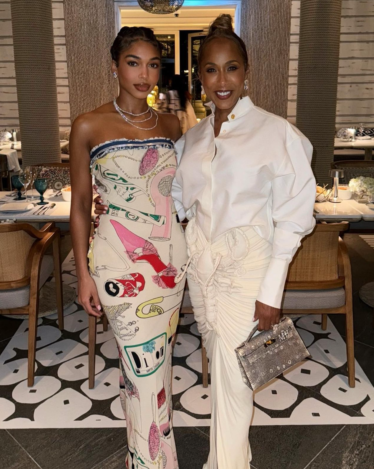 Lori and Marjorie Harvey were mother/daughter style goals for dinner, with Lori in a Spring 2021 Dior Doodle Print dress and Marjorie in Schiaparelli Spring 2024: