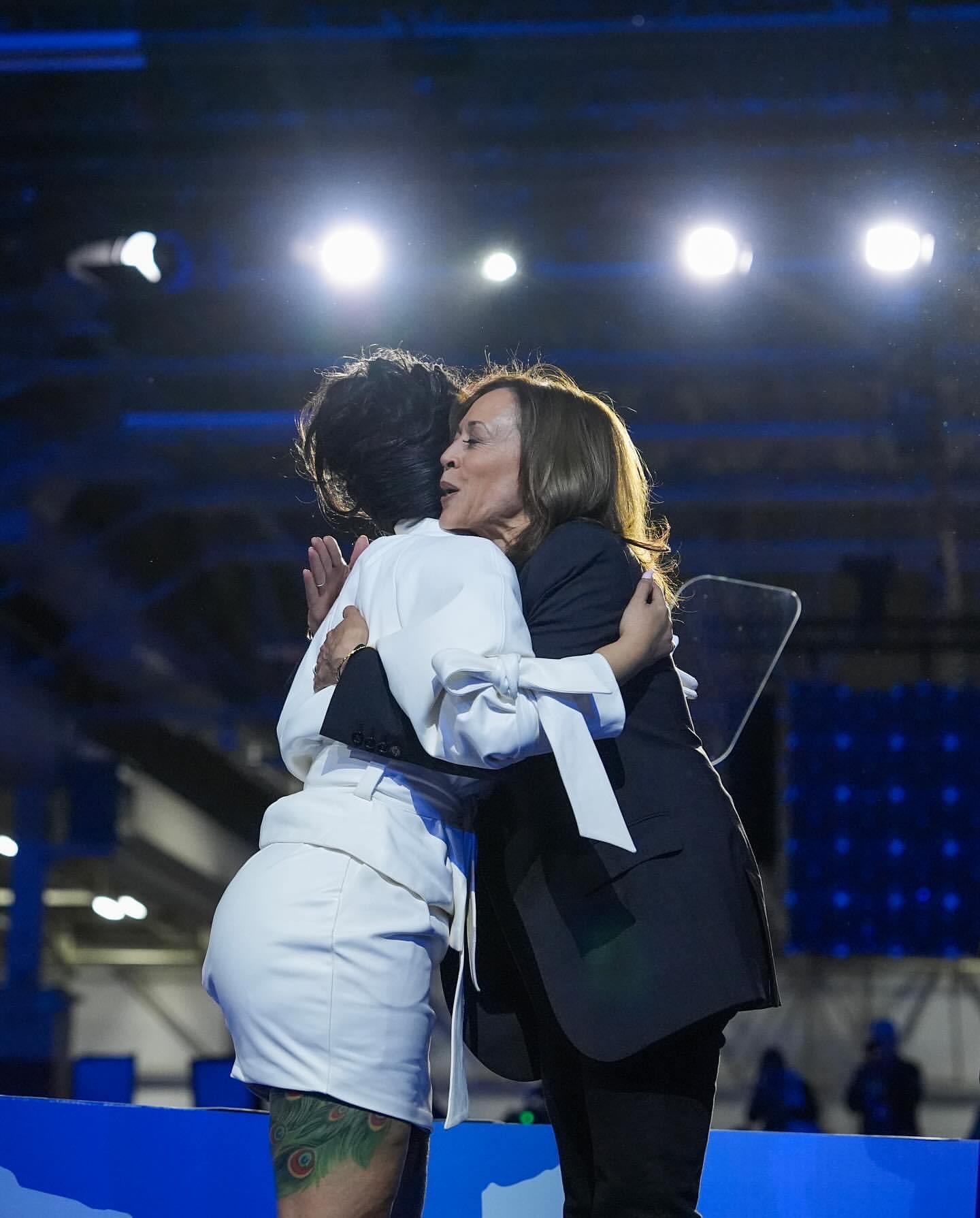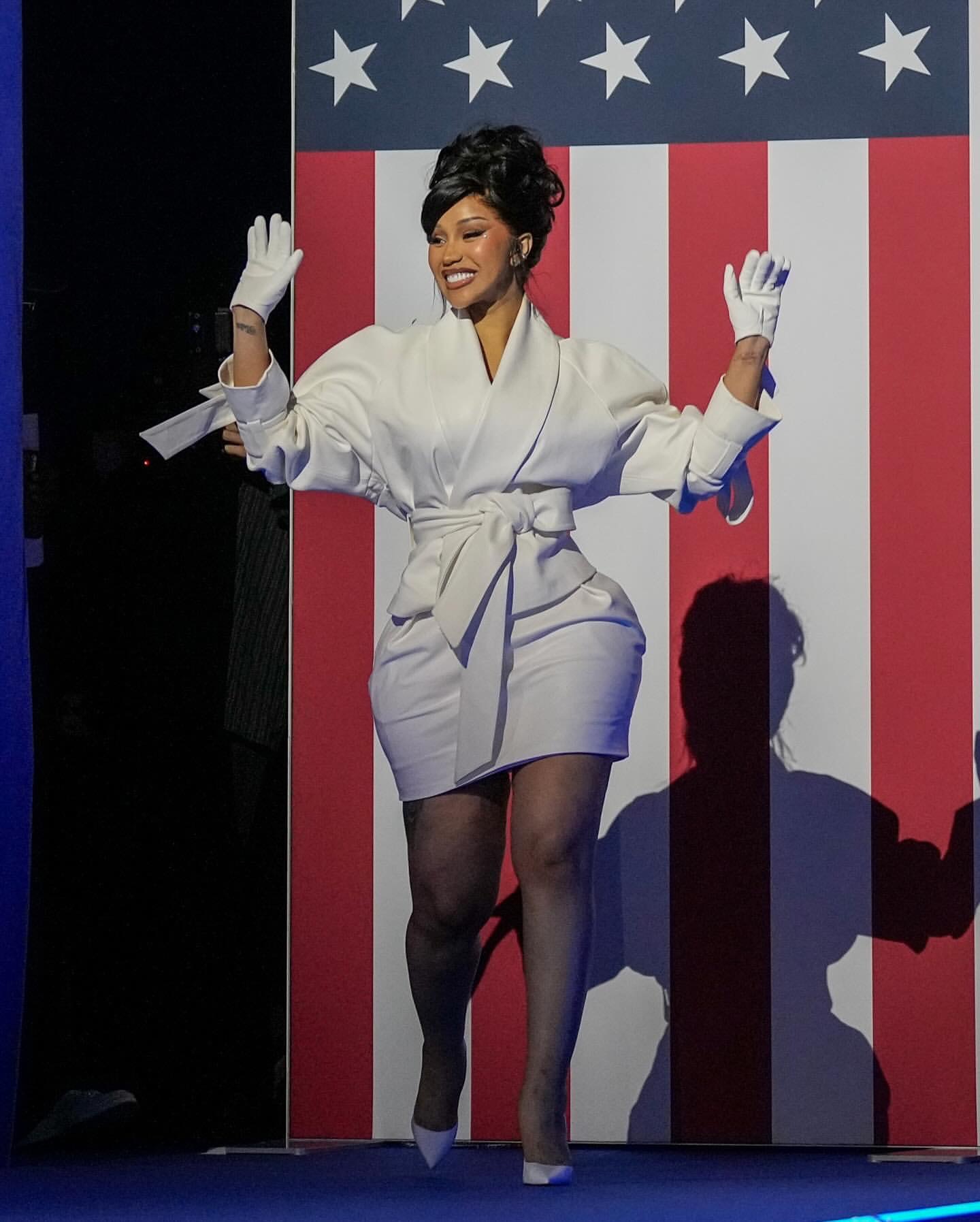 Cardi B spoke at a Kamala Harris rally in Milwaukee wearing a suit by Kristina Fidelskaya and Christian Louboutin pumps, styled by Kollin Carter .