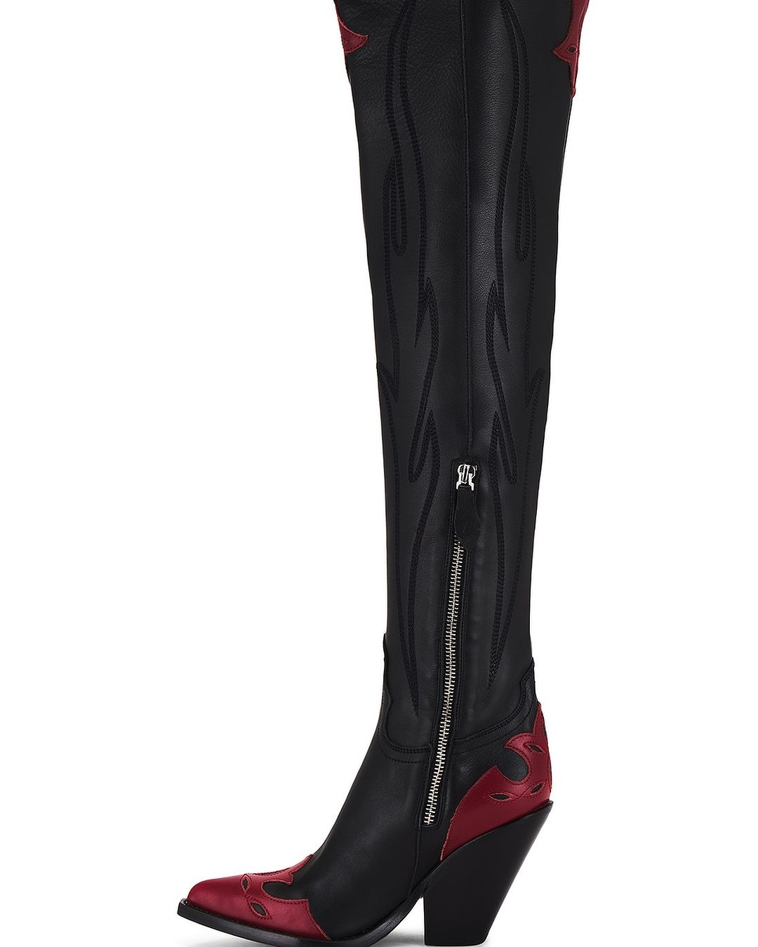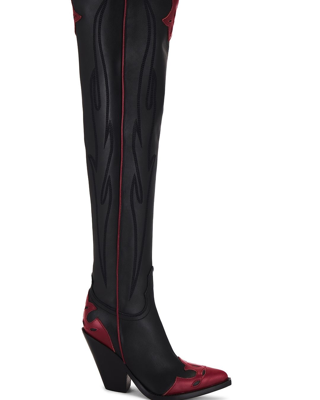 Her black thigh high leather boots which feature contrast red ornaments were made in Italy and are characterized with a pointed toe and wooden block heel.