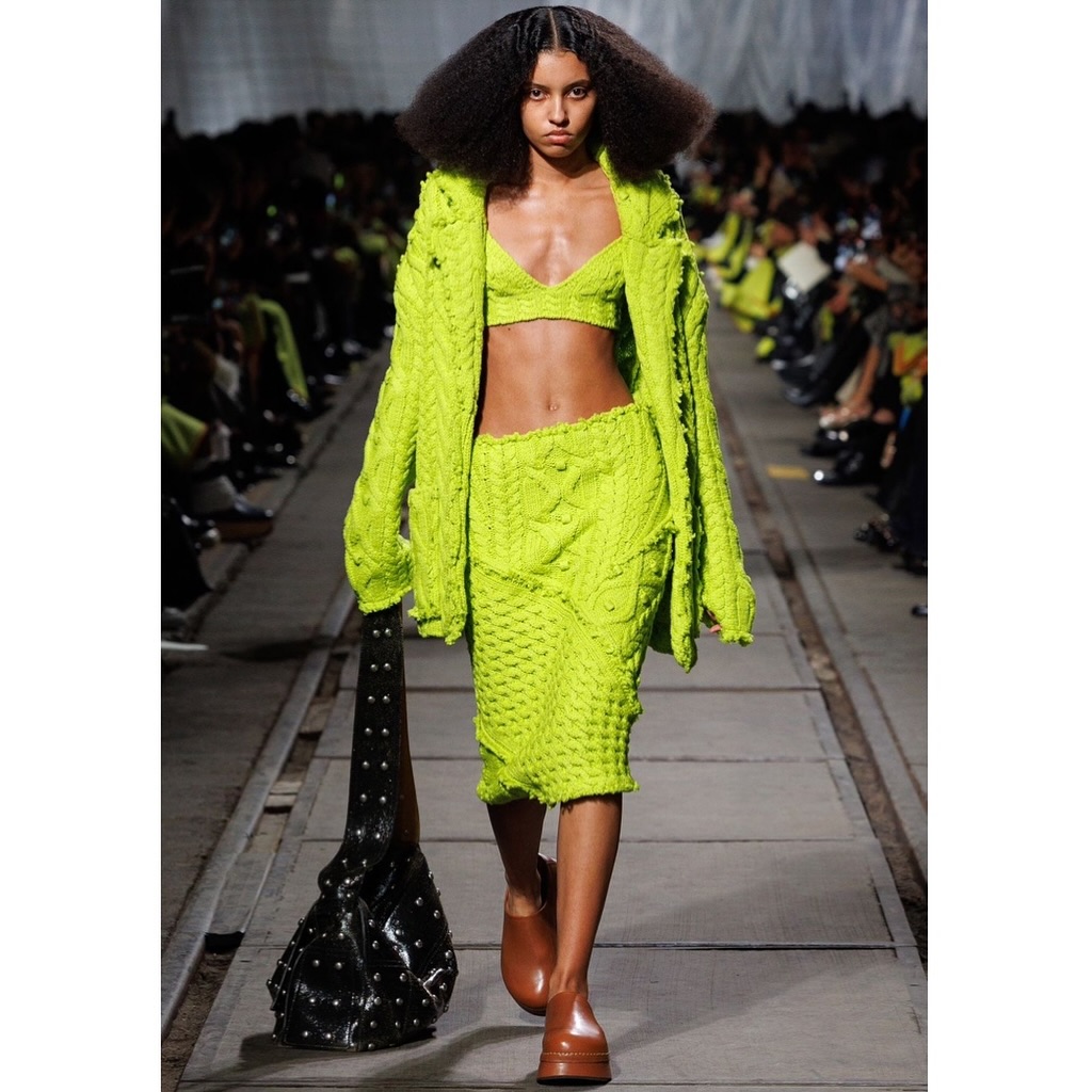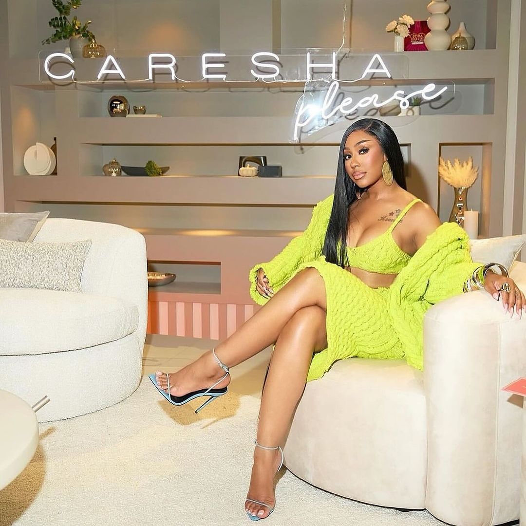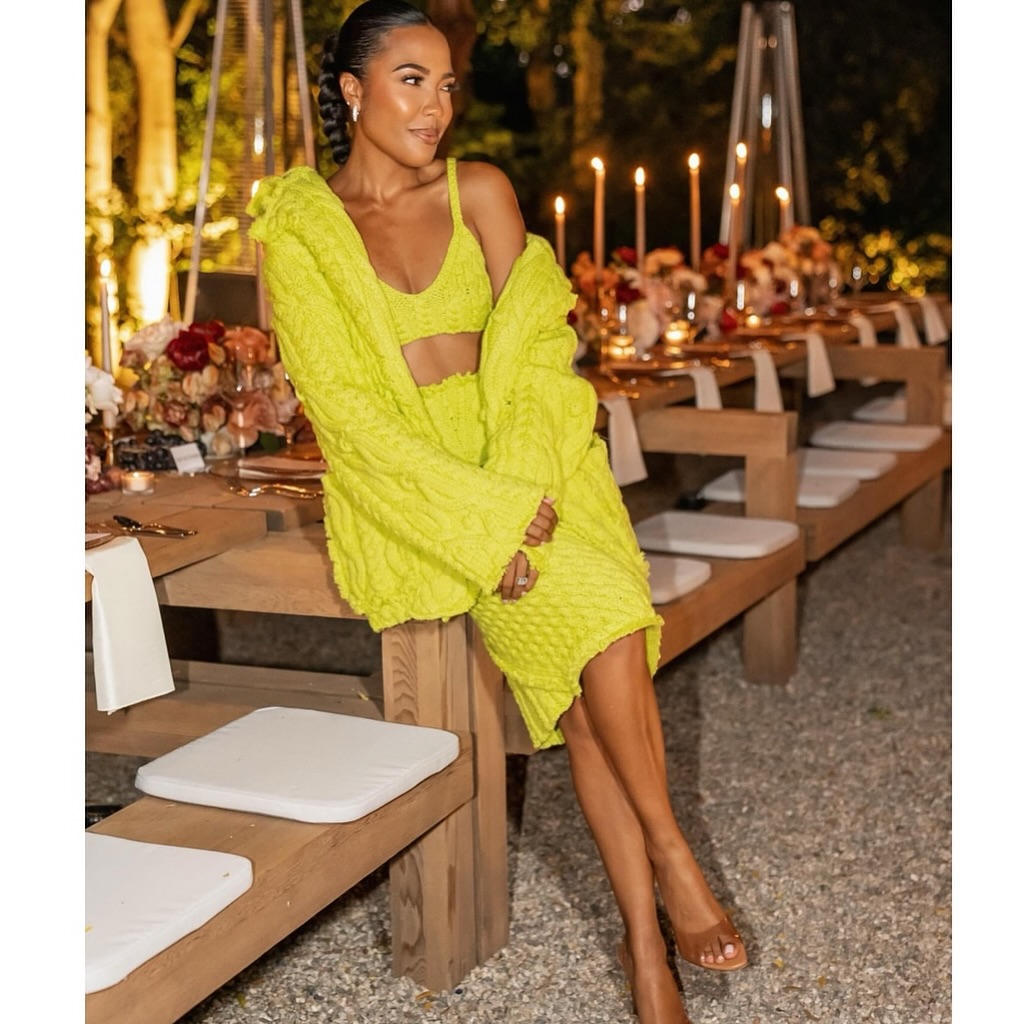 Yung Miami also chose to partake in the 3-set knitted trend, wearing the British designer on the set of her ‘Caresha Please‘ show. Her baby blue open toe heels and gold circular statement earrings added a nice contrast to her acid yellow hue.