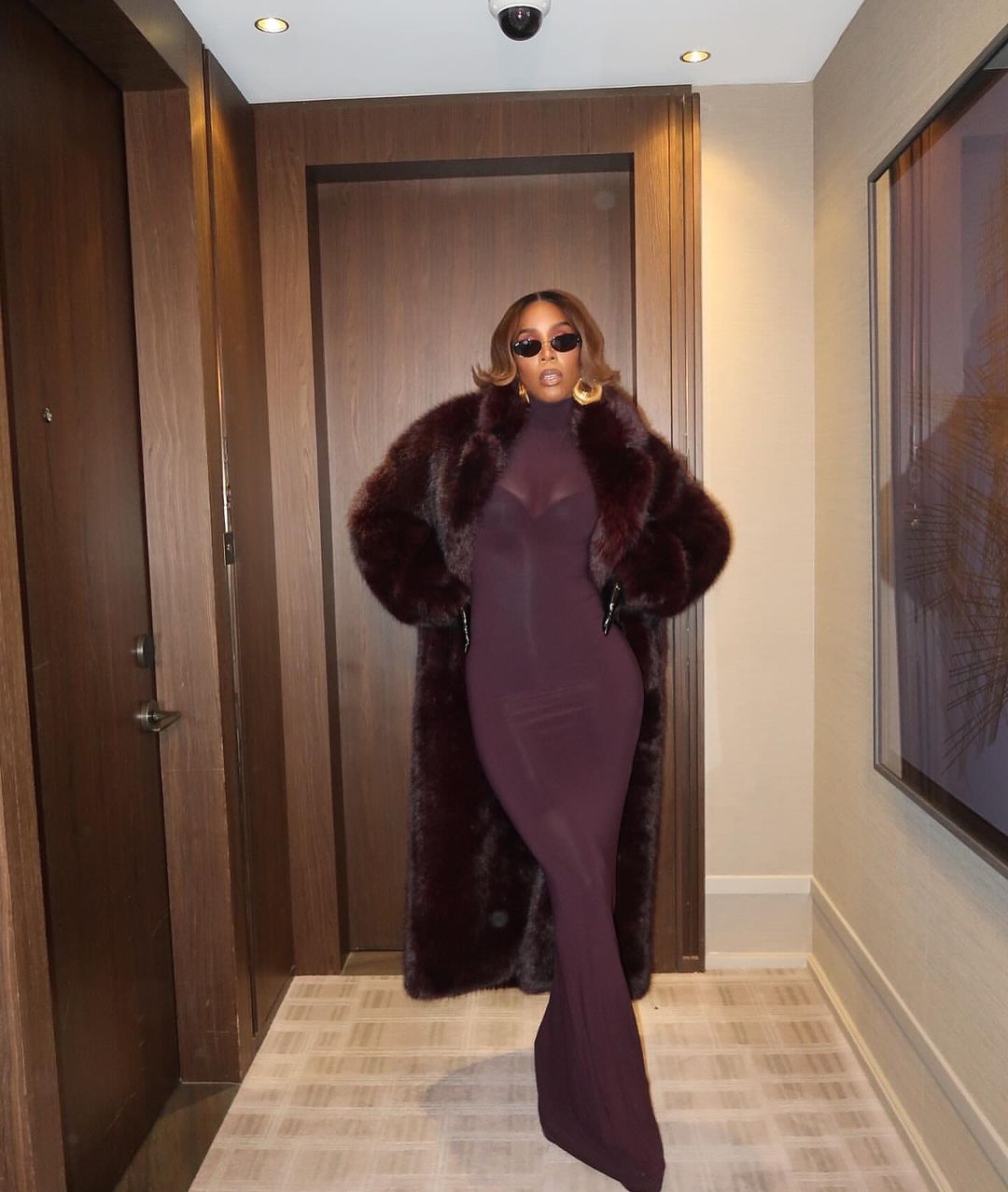 Kelly Rowland stepped out looking sizzling haute, and stylishly on trend for the fall season in a burgundy ‘Sons of Gemini’ maxi bodycon dress that she layered with a $1,490 Retrofete faux fur coat.