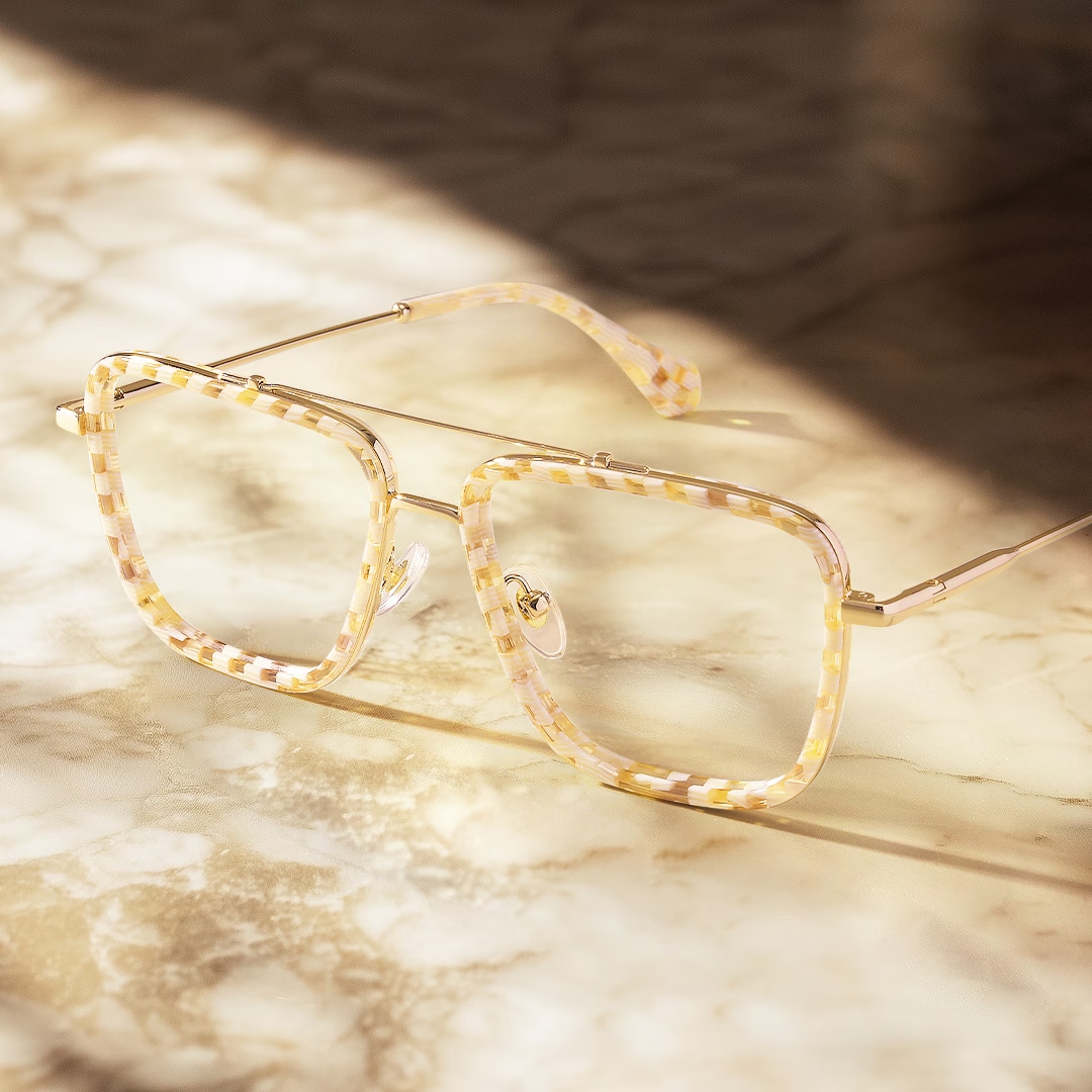 - Isla: a refined aviator frame featuring a striped acetate front with sleek metal temples, crafted for durability and sophistication.