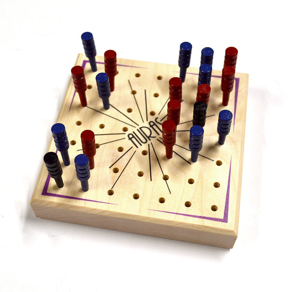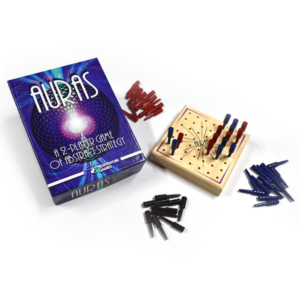 Each peg influences the spaces and pegs around it. With careful placement, an empty space can be claimed, or an occupied space can be emptied. As you gain control of more space, you approach the end game with confidence. But spaces can also be rendered unusable in certain circumstances, and new tactics must be applied. Auras is an abstract strategy game requiring visualization of many possible patterns, and deciding which is best, defense or offense, plan ahead or take control? Made in the USA for 2 players age 8+.