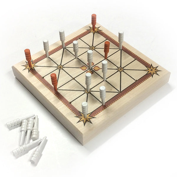 This deluxe version is nearly twice the size (5.5-inch square solid wood board) the the original Peg Pastimes™ travel version of Bagh Chal. With full-color artwork, the larger board allows easier play due to the spacing of the peg holes.