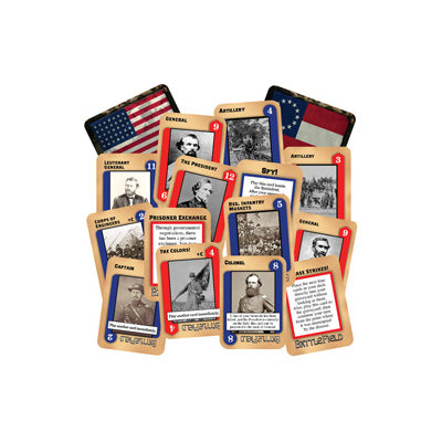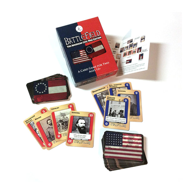 A Civil War era game of war, from David & Joe McCord of NewVenture Games. This second Battlefield game edition features two illustrated 72-card decks of real American Civil War characters (North and South, Confederate and Yankee) ready to face-off on the field of battle. Includes 144 cards plus instructions. Made in USA. Average game play of 45-60 min. for 2 players age 12+.