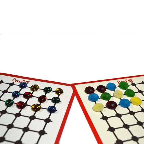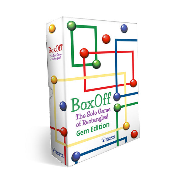 The BoxOff solo game experience is based on the recognition of rectangles with two opposing corners defined by two same-colored gems. Once such a rectangle is identified, and if there are no other gems within the rectangle or on its edges, these two gems can be removed. Sounds easy? Think again. Contains 64 gems (16 each of 4 bright colors), rules and printed rubber-backed board. Choose between shiny, translucent gems and frosted, matte gems. Also available in a cribbage peg version for mobile play. Made in the USA for one player age 8+.