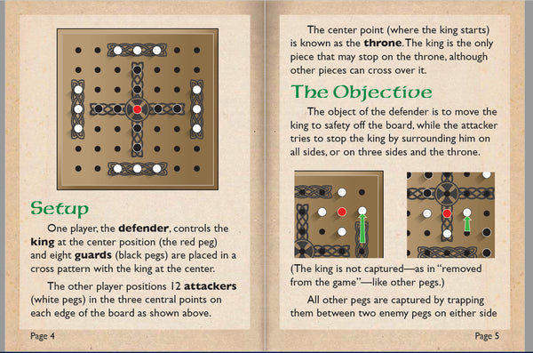 Two-player strategy game Brandubh (pronounced “bran-doov” with the trailing “v” barely sounded) is descended from Norse tafl games (likely a variant of the Welsh game tawlbrrd). A strategy game for 2 players, ages 6+. Made in USA. WARNING CHOKING HAZARD: Small Parts Not for children under 3 years.