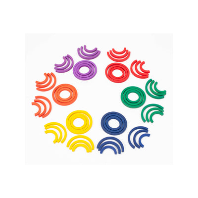 Also referred to as Froebel's 8th Gift (also known as Gabe 9), these colored wood rings and half-rings allow children to explore the possibility of the curved line with a vast amount of creative design potential. This set contains 216 semi-circular and wood ring pieces in 6 different colors (red, orange, yellow, green, blue, purple): 6 rings of each color/size and 6 half-rings of each color/size. Use circles and semi-circles can be used to make abstract patterns, to create letter/number forms and pictograms, or for learning basic math concepts. A simple but powerful learning tool for a early learner classroom or homeschool environment. Comes with a sturdy wood slide-top box. Made in China. For ages 3+. Small parts warning: This item contains small pieces that may pose a potential choking hazard. Intended for use with adult supervision.