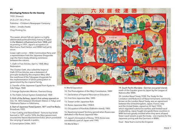 Design, popular culture, history, art, manga, and comics come together in a visual self-portrait of modern Japan, illustrated by events depicted in traditional Japanese board games known as sugoroku. This dazzling collection is a gateway to an influential art form little known outside Japan. Sugoroku themes included nearly every aspect of Japanese society, including history and war, fashion, sports, education, public health, adventure, and politics. Almost every significant incident and social movement from the mid-19th to mid-20th century Japan appeared on sugoroku. Curated by art collector/historian and author, Norman Brosterman (Inventing Kindergarten, Out of Time: Designs for the 20th Future). First edition. Softcover, 99pp.
