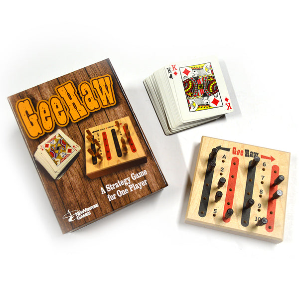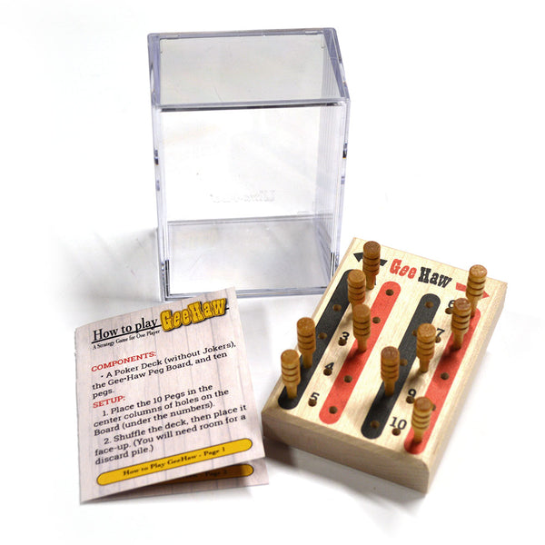 Gee-Haw is a solitaire game using a standard poker deck (included) and the Gee-Haw score board. Get all your pegs to either the red or the black side of the board, based on the suits of the numbered cards and the powers of the face cards. You decide how to utilize most of the card values, but a few have unavoidable consequences. Can you accomplish the goal before the deck runs out? Average game time is 10 minutes. Made in the USA for 1 player age 8+.