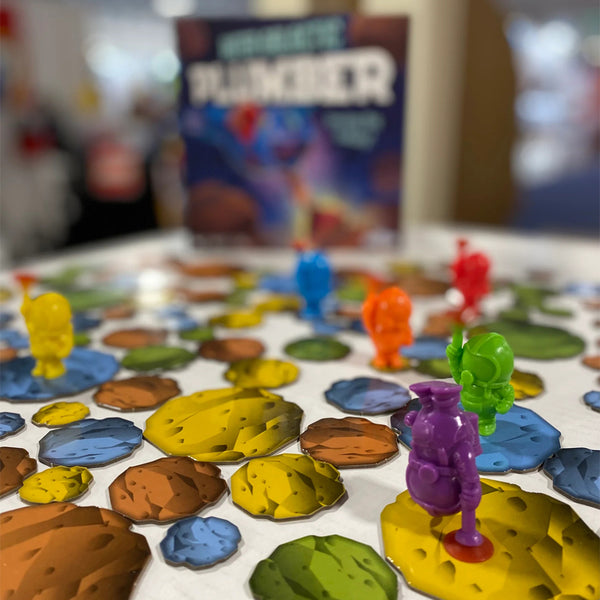 The solar system is clogged with asteroid junk, ice chunks, and space gunk. You are an Inter-Galactic Plumber tasked with plunging away the build-up of space crap. The more you plunge, the more money you make! Outwit other plumbers by stranding them in space debris, while you plunge to victory! The plumber pieces in this game have real suction action. Contains 144 asteroids, 6 plumbers, 2 dice, rules. Play time is 30 min. For 2-6 players age 8+. Made in China.