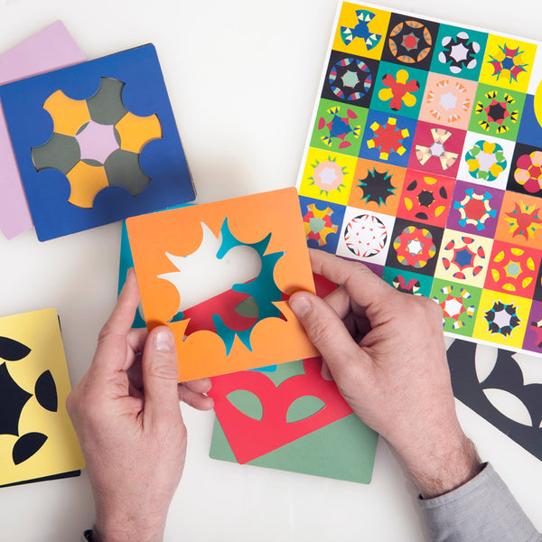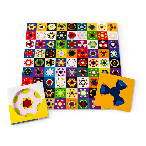 The 9 die-cut cards (and 3 solid backers) of the Kaleidograph® can be arranged into billions of designs. Based upon geometry in nature, the Kaleidograph upholds the tradition of the original creative design toys of the Froebel Kindergarten system that are known to have influenced Albert Einstein, Frank Lloyd Wright, Buckminster Fuller, Piet Mondrian, and design education at the Bauhaus.