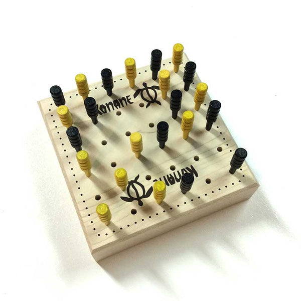 Kōnane is an ancient two-player strategy board game from Hawaii. Before contact with Europeans, the game was played using small pieces of white coral and black lava on a large carved rock which doubled as both board and table. Konane is sometimes called “Hawaiian Checkers,” but aside from jumping captures, there is almost no resemblance. Konane does have some similarities to the games of Leap Frog and Main Chuki (or Tjuki). The more you play the more you'll see the deeper strategies.