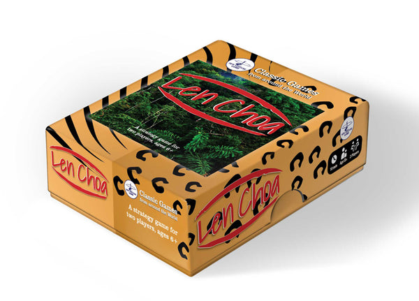 Len Choa is a game from ancient Siam, but also played with variations in other parts of southeast Asia. One player takes on the role of a Tiger, and the other has control of six Leopards. The Tiger eliminates Leopards with a simple jump to an empty space beyond, following the lines on the board. The Leopards' task is to trap the Tiger so it cannot move. It's a common type of game (Hounds and Hares, Fox and Geese, etc.) except for the configuration of the board and the initial "drop phase" of the game. Made in USA for 2 players ages 6+.