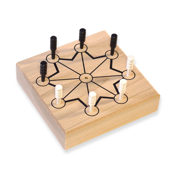 MuTorere™ is a strategy boardgame for two players. The game originated among the Maori tribes of New Zealand and early colonists discovered the game . Mu Torere appears to be an easy game to play, but the settlers were often beaten by Maori players who appreciated the game’s strategy. Includes a 4-inch square wood game board, two sets of pegs, and complete instructions. Made in USA for ages 6+.
