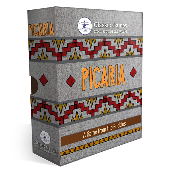 Picaria is a Native American two-player strategy game from the Zuni or Pueblo Indians of the American Southwest. It is related to tic-tac-toe, but closer to Three Men's Morris, Nine Holes, Achi, Tant Fant, and others, because the pegs can be moved to create the three-in-a-row. It’s not unique in that fact. An exact twin of the game can be found in Scandinavia, where it’s called “luffarshack”, and in Asia as part of the Ko-No tradition. Average game play is 20 minutes. Made in the USA for two players age 6+.