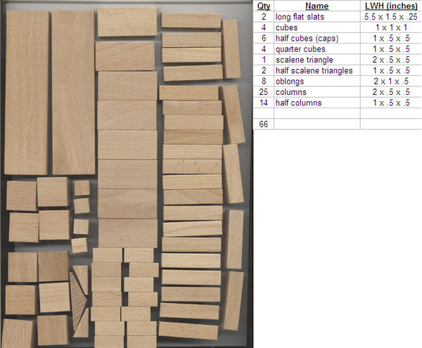 This set contains 68 blocks (plus the box and lid). The blocks are identical to Froebel Gifts blocks in size and material. An instruction sheet is provided with information on Wright and how to assemble the house design and put the blocks away.