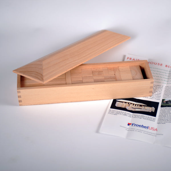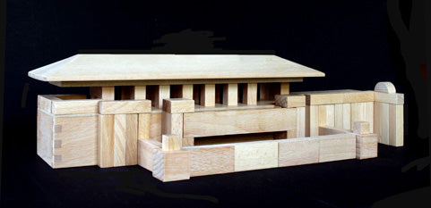 This Prairie House building set is based on the work of American architect Frank Lloyd Wright. His mother provided sets of Froebel® Gifts (wood blocks) to him at an early age in the hopes that he might one day become an architect. Even as an adult, Wright often used the Froebel blocks as a scratch pad during the design process. Wright’s work in the Prairie Style can be seen in his Robie House, Coonley House, and Dana House commissions. The Prairie Style features free-flowing interiors, low roofs, and horizontal profiles.