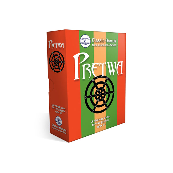 Pretwa is a strategy game of the AlQuerques family, and has been called “checkers on a wheel.” The origins of the game are vague, but it most certainly was a product of Medieval India. A larger version was known as Gol-Skuish. Average playtime is 20 minutes. Made in the USA for two players age 6+.