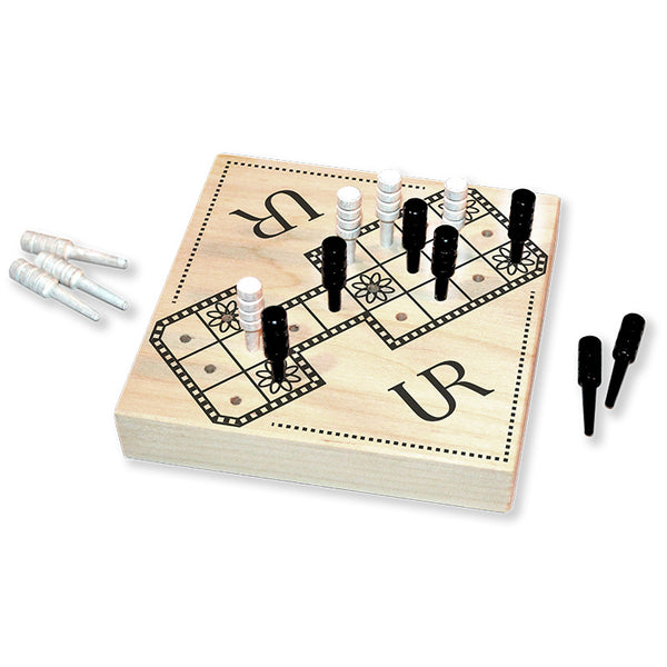 In 1926, Sir Leonard Woolley uncovered what may be the oldest board game ever found. Taken from an ancient royal cemetery, the game as become known as the Royal Game of Ur. Considered the “grandfather of backgammon,” dating back over 5,000 years, it’s certainly ancient ... but still fun and engaging after all this time. The Royal Game of UR is a "running fight” game, as well as a capturing game. This super-portable, travel-size version is rendered on a 4-inch square solid wood board ... the perfect size for playing in a car, on a plane or at a campsite. Standard cribbage pegs are used for pieces so they stay in place until moved. Made in the USA for 2 players ages 6+.