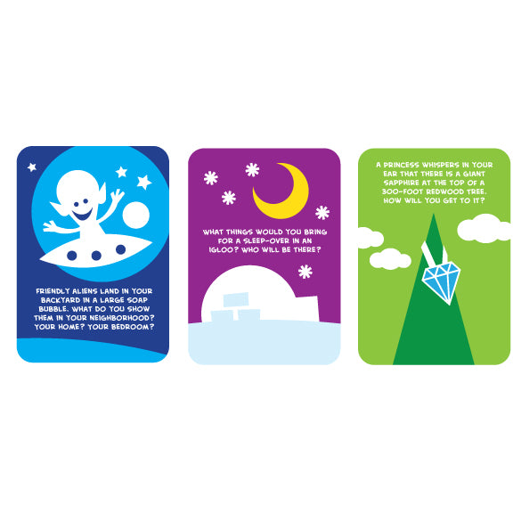 This deck of 50 cards with open-ended scenarios will spark your imagination, encourage problem-solving and get kids talking. Good silly fun with no right/wrong answers, this deck is useful for building lateral problem-solving skills, and helping kids unplug and use their imagination. Use the cards to inspire art projects, dress up or drama activities, prompt creative writing or public speaking.