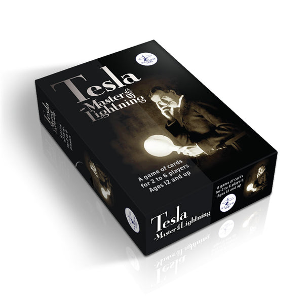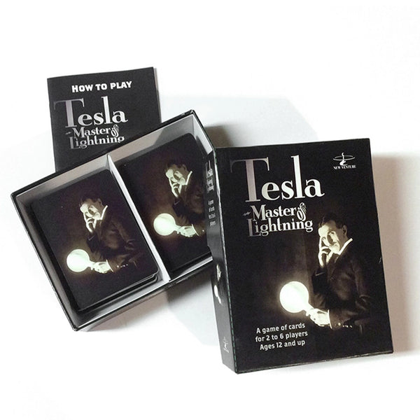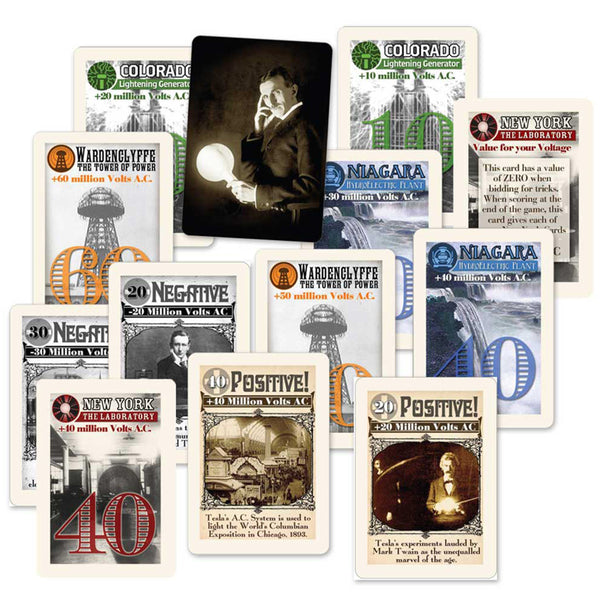 A "high-voltage" trick-taking and deck-building card game by David McCord of NewVenture Games. The card values reflect aspects of the life and works of Nikola Tesla, genius inventor of the early 20th century. Average game-play duration of 30 minutes. Made in USA for 2-6 players age 8+.