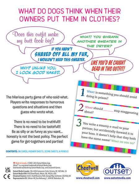 What?® is the perfect party game for large groups. Easy to play rules get people quickly guessing, who-said-what, as responses to questions are read out loud. It's also the perfect house warming gift for humorous humans! Three categories of questions include: general questions, fun fill-in-the-blank questions (use the name of a celebrity or someone playing), sticky situational questions!