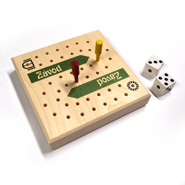 Závod is a peg-and-dice game that challenges players to a race. Aside from the crowded track, players need to choose how they use their die results. Should you pace yourself and hold back? Burst ahead to take the lead? Stay with the pack? But keep in mind that the first player in every round is the player in last place. Závod is a simple race game for kids, and a fun game for family outings. Made in USA for 2 players age 6+.